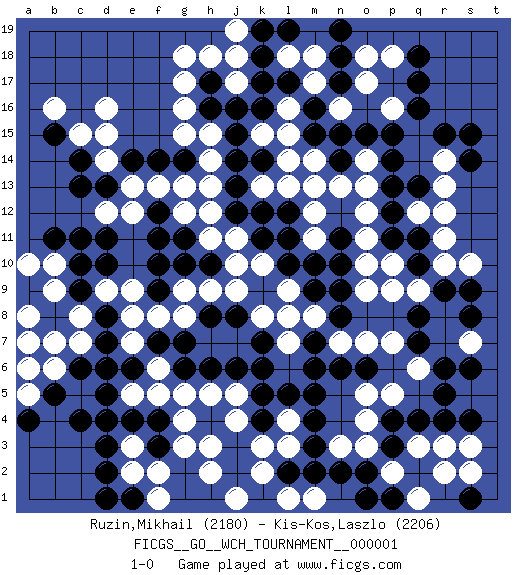 Last move : 1-0 2008 April 1 12:1:42 [Event "FICGS__GO__WCH_TOURNAMENT__000001"] [Site "FICGS"] [Date "2007.07.12"] [Round "1"] [Black "Ruzin,Mikhail"] [White "Kis-Kos,Laszlo"] [Result "1-0"] [Rating 1 "2180"] [Rating 2 "2206"] 1.q16 d4 2.q4 d16 3.q10 o3 4.m3 r3 5.r4 q3 6.p4 o4 7.p3 p2 8.q2 r2 9.o2 q1 10.n2 o5 11.s4 s3 12.q7 k3 13.m5 o7 14.n6 p5 15.r6 p7 16.m9 o9 17.n10 m8 18.n8 n7 19.m7 l8 20.n9 l7 21.m6 q9 22.q8 p10 23.r9 p9 24.k4 j4 25.j3 l4 26.k5 l3 27.m4 h3 28.j2 h2 29.h4 j5 30.j6 h5 31.h6 g5 32.l5 k2 33.k9 j7 34.j8 h7 35.k7 k8 36.k6 j9 37.h8 l9 38.l10 k10 39.g7 r10 40.q11 r11 41.s9 q12 42.l11 o17 43.o15 p16 44.p11 o11 45.p12 o12 46.p13 o10 47.k11 o13 48.p14 j11 49.h10 j10 50.j12 h11 51.g11 h12 52.j13 g12 53.f11 l13 54.l12 o14 55.p15 k13 56.m13 m14 57.m15 m12 58.k12 l15 59.g14 h9 60.g10 g9 61.f9 f8 62.f12 e9 63.f10 g8 64.f7 f13 65.d11 e7 66.l2 j1 67.e6 f6 68.g6 f5 69.d7 e8 70.c6 e13 71.d10 c8 72.d8 d9 73.c9 g13 74.d13 c7 75.d6 b6 76.b5 b9 77.c10 b7 78.c4 b10 79.b11 a8 80.d3 d14 81.c14 d12 82.c13 e12 83.c11 c15 84.b15 b16 85.e14 d15 86.f14 h14 87.j14 h15 88.j15 h13 89.h16 g15 90.m16 l16 91.l17 m17 92.k17 n16 93.n15 g16 94.h17 n3 95.o1 l1 96.m2 m1 97.s1 s2 98.p1 m11 99.m10 m18 100.q17 p18 101.q18 l18 102.k18 g17 103.n18 o18 104.n19 h18 105.k16 n13 106.n17 k15 107.k14 l14 108.e4 j17 109.n14 m13 110.j16 j18 111.l19 e2 112.d2 e3 113.f4 e5 114.d5 g4 115.f3 f2 116.e1 g3 117.d4 r14 118.r15 r13 119.q13 r12 120.s15 f1 121.d1 a5 122.a6 a7 123.a4 a10 124.n11 q6 125.r5 s7 126.s6 s10 127.s8 j19 128.k19 g18 129.s14 a6 130.o6 1-0 Here are the names of the openings (joseki) played in the four corners : Corner q4 : q4 o3 Hoshi (Hwajeom, Seongjeom, Xingwei`) 4-4 Point. The star or hoshi (4-4) point, emphasizing influence at the potential expense of territory. Ikken Kakari (Hankan Keolch'im, Yi Gua`jiao~, 1-Space Low Approach). White 2 is the standard approach move to the 4-4. Player Black won this Go (weiqi, baduk) game. Follow this game move after move (download)The second line is the line of defeat, the third line is the line of territory, and the fourth line is the line of influence. (Anonymous) A generalist learns less and less about more and more until he knows nothing about everything. (Author unknown)