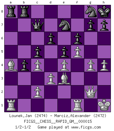 Last move : 1/2-1/2 2021 June 12 17:18:53 [Event "FICGS__CHESS__RAPID_GM__000015"] [Site "FICGS"] [Date "2021.05.30"] [Round "1"] [White "Lounek,Jan"] [Black "Marciz,Alexander"] [Result "1/2-1/2"] [WhiteElo "2474"] [BlackElo "2472"] 1.e4 c5 2.Nf3 Nc6 3.Nc3 e5 4.Bc4 d6 5.d3 Be7 6.Nd2 Nf6 7.Nf1 Bg4 8.f3 Be6 9.Ne3 O-O 10.O-O Rb8 11.a4 a6 12.Rf2 Qd7 13.Bd2 Bd8 14.Kh1 Re8 15.Qg1 Kh8 16.h4 Nh5 17.Qh2 Ba5 18.Ned5 Bxd5 19.Bxd5 Nf6 20.Ba2 b5 21.Bg5 Bxc3 22.bxc3 Ng8 23.Be3 Rf8 24.axb5 axb5 25.Bb3 Nce7 26.g4 Rbc8 27.c4 b4 28.Ba4 Qa7 29.R2f1 Ra8 30.f4 f6 31.f5 Rfb8 32.Qg1 Qc7 33.Qg2 1/2-1/2 Sicilian defense Kingside Castling by player Black (move 9) Kingside Castling by player White (move 10) This chess game ended in a draw. Follow this game move after move (download)Tactics flow from a superior position. (Bobby Fischer) Die Arbeit ist etwas Unnatürliches. Die Faulheit allein ist göttlich. (Anatole France) La esencia del Ajedrez es pensar acerca de lo que el Ajedrez es. (David Bronstein) Botvinnik disait en comparant les échecs à la musique: Il existe une science dont le but est l'étude de l'acoustique et des sons. Mais il y a aussi un art qui se sert de l'océan des sons : c'est la musique. De toute évidence, il en est de même pour la pensée. La logique est l'étude des lois de la réflexion et les échecs reflètent, en tant qu'art, le côté logique de la réflexion, sous la forme d'images artistiques... Extrait de Fischer - Spassky, Reykjavik 1972 par Alexander & F. Wyndham (Ed. Solar), p 37. There are three kinds of lies: lies, damned lies and statistics. (Mark Twain)