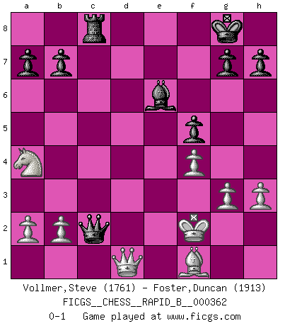 Last move : 0-1 2021 July 25 11:7:12 [Event "FICGS__CHESS__RAPID_B__000362"] [Site "FICGS"] [Date "2021.05.30"] [Round "1"] [White "Vollmer,Steve"] [Black "Foster,Duncan"] [Result "0-1"] [WhiteElo "1761"] [BlackElo "1913"] 1.d4 f5 2.c4 Nf6 3.Nf3 e6 4.g3 d5 5.Bg2 c6 6.cxd5 exd5 7.Nc3 Bd6 8.O-O O-O 9.Qc2 Ne4 10.Ne5 Nd7 11.f4 Ndf6 12.Rf3 Be6 13.h3 c5 14.e3 Rc8 15.Bd2 Qb6 16.dxc5 Rxc5 17.Nd3 Nxd2 18.Qxd2 Rc7 19.Rc1 Ne4 20.Qe1 Be7 21.Bf1 Bf6 22.Na4 Rxc1 23.Qxc1 Qd6 24.Qd1 Rc8 25.Nf2 d4 26.exd4 Bxd4 27.Kg2 Nxf2 28.Rxf2 Qc6+ 29.Kg1 Bxf2+ 30.Kxf2 Qc2+ 0-1 Dutch defense Kingside Castling by player White (move 8) Kingside Castling by player Black (move 8) Player Black won this chess game. Follow this game move after move (download)Chess is a part of culture and if a culture is declining then Chess too will decline. (Mikhail Botvinnik) Ich würde mich als ganz normalen Jungen bezeichnen [Im Alter von 12]. (Sergej Karjakin) ¿Quién es tu oponente esta tarde? Esta tarde mi oponente son las piezas negras. (Akiba Rubinstein) Les échecs sont utiles à l'exercice de la faculté de penser et à celle de l'imagination. Car nous devons posséder une méthode élaborée pour atteindre des buts partout où nous devons conduire notre raison. (Leibnitz) The ego is not master in its own house. (Sigmund Freud)