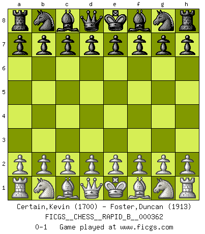 Last move : 0-1 2021 June 29 18:54:30 [Event "FICGS__CHESS__RAPID_B__000362"] [Site "FICGS"] [Date "2021.05.30"] [Round "1"] [White "Certain,Kevin"] [Black "Foster,Duncan"] [Result "0-1"] [WhiteElo "1700"] [BlackElo "1913"] 0-1 This chess game has been lost on time (started : 2021.05.30 18:3:12) Player Black won this chess game. Follow this game move after move (download)Suddenly it was obvious to me in my analysis I had missed what Fischer had found with the greatest of ease at the board. (Mikhail Botvinnik) Intelligenz läßt sich nicht am Weg, sondern nur am Ergebnis feststellen. (Garry Kasparov) Si tu oponente no puede hacer nada activo, entonces no apures la posición; En vez de eso, dejalo estar sentado ahí, sufriendo y rogandote por un empate. (Jeremy Silman) La tactique est l'élément le plus important du milieu de jeu. (Siegbert Tarrasch) Do you know these so called Volunteers don't even get paid! (Simpsons)