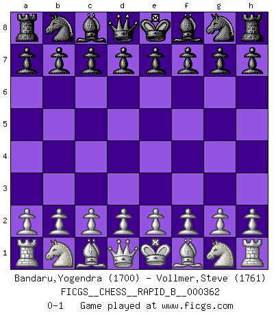 Last move : 0-1 2021 June 29 18:54:30 [Event "FICGS__CHESS__RAPID_B__000362"] [Site "FICGS"] [Date "2021.05.30"] [Round "1"] [White "Bandaru,Yogendra"] [Black "Vollmer,Steve"] [Result "0-1"] [WhiteElo "1700"] [BlackElo "1761"] 0-1 This chess game has been lost on time (started : 2021.05.30 18:3:12) Player Black won this chess game. Follow this game move after move (download)In blitz, the Knight is stronger than the Bishop. (Vlastimil Hort) Ich war schon mal beim Dopingtest. Da musste ich Urin abgeben, während Dritte zusahen. (Elisabeth Pähtz) Con o sin el título, Bobby Fischer fue sin lugar a dudas el mas grande jugador de su época. (Burt Hochberg) Le moment que je préfère le plus dans une rencontre, c'est celui où je sens que la personnalité de l'adversaire se brise. (Robert Fischer) I live to kill Traxler counterattack. (Ilmars Cirulis)