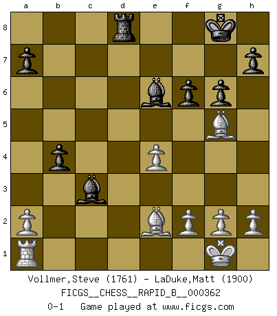 Last move : 0-1 2021 June 19 23:29:33 [Event "FICGS__CHESS__RAPID_B__000362"] [Site "FICGS"] [Date "2021.05.30"] [Round "1"] [White "Vollmer,Steve"] [Black "LaDuke,Matt"] [Result "0-1"] [WhiteElo "1761"] [BlackElo "1900"] 1.d4 Nf6 2.c4 g6 3.Nc3 d5 4.e3 Bg7 5.Nf3 O-O 6.Bd3 c5 7.O-O cxd4 8.Nxd4 e5 9.Nde2 e4 10.Bc2 dxc4 11.Nxe4 Nc6 12.Nd4 Nxd4 13.Qxd4 Nxe4 14.Qxd8 Rxd8 15.Bxe4 Be6 16.Bc2 b5 17.Rd1 Rxd1+ 18.Bxd1 Rd8 19.Be2 b4 20.e4 c3 21.bxc3 Bxc3 22.Bg5 f6 0-1 King's Indian defense, 3.Nc3 Kingside Castling by player Black (move 5) Kingside Castling by player White (move 7) Player Black won this chess game. Follow this game move after move (download)The Pin is mightier than the sword. (Fred Reinfeld) Das Schach hält seine Meister in eigenen Banden, Fesseln; auf vielerlei Weise formt es ihren Geist, so dass die innere Freiheit selbst des Stärksten beeinflusst wird. (Albert Einstein) Aquel que ve no otra dirección en el juego que la de dar Jaque Mate a su oponente, nunca será un buen jugador de Ajedrez. (Euwe) Le pion, dans sa simplicité, marche droit devant lui, mais lorsqu'il prend, il le fait obliquement? Ainsi l'homme, tant qu'il reste pauvre, marche dans la droiture et vit honnêtement, mais lorsqu'il recherche les honneurs, il flatte, se parjure et, par les voies obliques, cherche une position supérieure sur l'échiquier du monde. (Jean de Galles) The difference between perseverance and obstinacy is that one comes from a strong will, and the other from a strong won't. (Henry Ward Beecher)