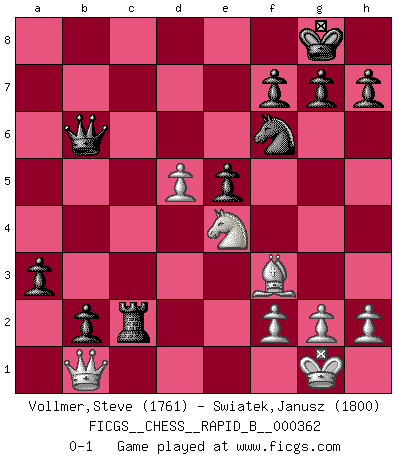 Last move : 0-1 2021 July 10 12:29:52 [Event "FICGS__CHESS__RAPID_B__000362"] [Site "FICGS"] [Date "2021.05.30"] [Round "1"] [White "Vollmer,Steve"] [Black "Swiatek,Janusz"] [Result "0-1"] [WhiteElo "1761"] [BlackElo "1800"] 1.d4 Nf6 2.c4 e6 3.Nf3 d5 4.Bg5 dxc4 5.e4 b5 6.a4 c6 7.axb5 cxb5 8.Nc3 Qb6 9.Qc2 Nbd7 10.Be2 Bb7 11.Nd2 Bb4 12.Bf3 e5 13.d5 O-O 14.O-O a5 15.b3 cxb3 16.Qxb3 Rfc8 17.Rac1 Ba6 18.Be3 Bc5 19.Bxc5 Nxc5 20.Qb1 b4 21.Ne2 a4 22.Nc4 Bxc4 23.Rxc4 b3 24.Rfc1 a3 25.Nc3 b2 26.Rc2 Ncxe4 27.Rxc8+ Rxc8 28.Nxe4 Rxc2 0-1 Queen's pawn game Kingside Castling by player Black (move 13) Kingside Castling by player White (move 14) Player Black won this chess game. Follow this game move after move (download)I know people who have all the will in the world, but still can't play good Chess. (Bobby Fischer) Meine Liebe ist Schach, Schach, Schach. Ich muss jeden Tag Schach spielen, deshalb fühle ich mich so stark. (Miguel Najdorf) El estómago es una parte esencial del maestro de Ajedrez. (Bent Larsen) Toutes choses étant égales, c'est la conviction qui gagne. Alliée à une volonté de vaincre, elle sert de détonateur, suscite des idées, disperse les doutes et aide à penser clairement. (Robert Fischer) The worth of a book is to be measured by what you can carry away from it. (James Bryce)