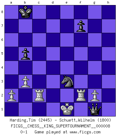 Last move : 0-1 2021 August 26 10:25:16 [Event "FICGS__CHESS__KING_SUPERTOURNAMENT__000008"] [Site "FICGS"] [Date "2021.06.02"] [Round "1"] [White "Harding,Tim"] [Black "Schuett,Wilhelm"] [Result "0-1"] [WhiteElo "2445"] [BlackElo "1800"] 1.e4 e5 2.f4 exf4 3.Nf3 Nf6 4.e5 Nh5 5.d4 d5 6.Be2 g5 7.O-O Rg8 8.c4 c6 9.Nc3 g4 10.cxd5 cxd5 11.Bb5+ Nc6 12.Ne1 Be6 13.Qc2 Qb6 14.Kh1 Qxd4 15.Qxh7 Ng3+ 16.hxg3 O-O-O 17.Qxg8 Qxe5 18.Nf3 Qh5+ 19.Nh4 Be7 20.Qxd8+ Bxd8 21.Bxf4 Bxh4 22.gxh4 Qxh4+ 23.Kg1 g3 24.Bxg3 Qxg3 25.Rf3 Qe5 26.Bf1 d4 27.Nb5 a6 28.Na3 Qc5 29.Rf2 Bf5 30.Rd1 Kb8 31.Nc4 d3 32.b3 b5 33.Nb2 Ne5 34.Nxd3 Bxd3 35.Bxd3 Ng4 36.R1d2 Qe3 37.Bf1 Qg3 38.Bxb5 axb5 39.Rc2 Qh2+ 40.Kf1 Ne3+ 41.Ke1 Qg1+ 0-1 KGA : Schallop defense Kingside Castling by player White (move 7) Queenside Castling by player Black (move 16) Player Black won this chess game. Follow this game move after move (download)I'm not afraid of Spassky. The world knows I'm the best. You don't need a match to prove it. (Bobby Fischer) Ohne Fehler kann es keine Brillanz geben. (Emanuel Lasker) Las leyes del Ajedrez no permiten una libre elección: tienes que mover quieras o no. (Emanuel Lasker) Les réformistes prétendent que les progrès de la théorie conduiront à la disparition des échecs, et qu'il faut, pour leur rendre vie, en remanier les règles. En réalité, qu'exprime cette affirmation? Le mépris de l'intuition, de l'imagination et de tous les autres éléments qui font des échecs un art. (Alexander Alekhine) For a mechanic, you seem to do an excessive amount of thinking. (C-3PO in Star Wars ep.2)