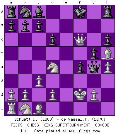 Last move : 1-0 2021 July 23 12:3:1 [Event "FICGS__CHESS__KING_SUPERTOURNAMENT__000008"] [Site "FICGS"] [Date "2021.06.02"] [Round "1"] [White "Schuett,Wilhelm"] [Black "de Vassal,Thibault"] [Result "1-0"] [WhiteElo "1800"] [BlackElo "2270"] 1.e4 e5 2.f4 exf4 3.Nf3 h6 4.Bc4 d6 5.h4 f6 6.c3 g5 7.Qb3 Qe7 8.Bxg8 Qxe4+ 9.Kf2 Kd8 10.Re1 Qf5 11.Nd4 Qg4 12.Re8+ Kxe8 13.Qf7+ Kd8 14.Qxf8+ Kd7 15.Qf7+ Kd8 16.Qxf6+ Ke8 17.Bf7+ Kf8 18.Bh5 1-0 KGA : Becker defense Player White won this chess game. Follow this game move after move (download)When you don't know what to play, wait for an idea to come into your opponent's mind. You may be sure that idea will be wrong. (Siegbert Tarrasch) Ich verstehe Aljechins Kombinationen ganz gut; aber woher er diese Angriffschancen bekommt und wie er die Eröffnung behandelt das ist für mich ein Buch mit sieben Siegeln. (Rudolf Spielmann) Observen a Garry Kasparov. Después de una derrota, invariablemente el gana la próxima partida. Prácticamente hace pedazos a su siguiente oponente. Eso es algo que tenemos que aprender a lograr. (Maurice Ashley) Les échecs sont un jeu par leur forme, un art par leur essence et une science par sa difficulté d'acquisition. Ils peuvent vous procurer autant de plaisir qu'un bon livre ou une belle musique, mais vous n'aurez une réelle joie que si vous arrivez à bien jouer. (Tigran Petrosian) A woman without a man is like a fish without a bicycle. (Gloria Steinem)