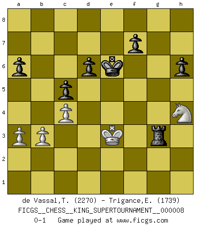Last move : 0-1 2021 July 21 17:39:14 [Event "FICGS__CHESS__KING_SUPERTOURNAMENT__000008"] [Site "FICGS"] [Date "2021.06.02"] [Round "1"] [White "de Vassal,Thibault"] [Black "Trigance,Emile"] [Result "0-1"] [WhiteElo "2270"] [BlackElo "1739"] 1.e4 e5 2.f4 exf4 3.Bc4 Qh4+ 4.Kf1 d6 5.c3 Nf6 6.d3 Ng4 7.Qf3 Ne5 8.Qf2 Qxf2+ 9.Kxf2 Nxc4 10.dxc4 g5 11.Na3 a6 12.Nc2 Bg7 13.Nd4 Nd7 14.g3 Ne5 15.Nf5 Bxf5 16.exf5 fxg3+ 17.Kxg3 h6 18.h4 gxh4+ 19.Rxh4 O-O-O 20.Be3 Rde8 21.Bd4 Rhg8 22.Kh3 Nd3 23.b3 Bxd4 24.cxd4 Re3+ 25.Kh2 Reg3 26.Rf1 Rg2+ 27.Kh1 Nf2+ 28.Rxf2 Rxf2 29.Rh2 Rf1 30.Rg2 Rxg2 31.Kxg2 Rxf5 32.d5 c6 33.dxc6 bxc6 34.Nf3 Kd7 35.Nh4 Rg5+ 36.Kf3 Ke6 37.Ke3 c5 38.a3 Rg3+ 0-1 KGA : Bishop's gambit Queenside Castling by player Black (move 19) Player Black won this chess game. Follow this game move after move (download)The defensive power of a pinned piece is only imaginary. (Aaron Nimzovich) Ich bin Weltmeister und muß mit niemandem irgend etwas diskutieren. (Viswanathan Anand) Cuando no sepas que mover, espera por una idea que se le venga a la la cabeza de tu oponente. Tenlo por seguro de que esa idea estará incorrecta. (Siegbert Tarrasch) Les sacrifices démontrent seulement que quelqu'un a gaffé. (Savielly Tartacover) The human is the only animal species whose members are able to talk themselves into difficulties that would not otherwise exist. (Wendell Johnson)