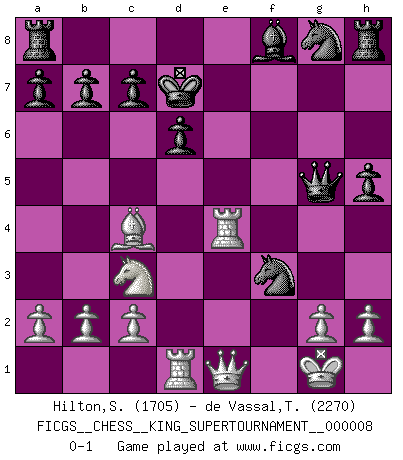 Last move : 0-1 2021 July 15 15:58:35 [Event "FICGS__CHESS__KING_SUPERTOURNAMENT__000008"] [Site "FICGS"] [Date "2021.06.02"] [Round "1"] [White "Hilton,Stephen"] [Black "de Vassal,Thibault"] [Result "0-1"] [WhiteElo "1705"] [BlackElo "2270"] 1.e4 e5 2.f4 exf4 3.Nf3 f6 4.d4 g5 5.Bc4 h5 6.O-O d6 7.Nc3 Bg4 8.Qe1 Bxf3 9.Rxf3 Nc6 10.e5 fxe5 11.dxe5 Nxe5 12.Bxf4 gxf4 13.Rxf4 Kd7 14.Rd1 Qg5 15.Re4 Nf3+ 0-1 King's knight's gambit Kingside Castling by player White (move 6) Player Black won this chess game. Follow this game move after move (download)Your body has to be in top condition. Your Chess deteriorates as your body does. You can't separate body from mind. (Bobby Fischer) Konzentriere dich auf materielle Gewinne. Nimm, was dir dein Gegner gibt, ausser es gibt einen guten Grund der dagegenspricht. (Robert James Fischer) Un mal plan es mejor que no tener ningún plan. (Frank Marshall) On n'a jamais que l'âge auquel on a commence à jouer aux échecs car après on cesse de vieillir. (Capablanca) The Internet isn't free. It just has an economy that makes no sense to capitalism. (Brad Shapcott)