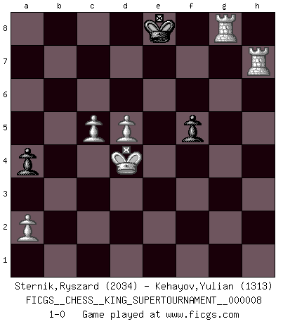 Last move : 1-0 2021 July 21 18:5:10 [Event "FICGS__CHESS__KING_SUPERTOURNAMENT__000008"] [Site "FICGS"] [Date "2021.06.02"] [Round "1"] [White "Sternik,Ryszard"] [Black "Kehayov,Yulian"] [Result "1-0"] [WhiteElo "2034"] [BlackElo "1313"] 1.e4 e5 2.f4 exf4 3.Nf3 d5 4.exd5 Bg4 5.h3 Bxf3 6.Qxf3 Qh4+ 7.Kd1 Nf6 8.d4 Qh5 9.Qxh5 Nxh5 10.Bb5+ c6 11.dxc6 Nxc6 12.d5 O-O-O 13.c4 Nd4 14.Nc3 a6 15.Ba4 g5 16.Re1 Bd6 17.Kd2 f3 18.Ne4 fxg2 19.Ke3 Rhe8 20.Kxd4 Bh2 21.Bxe8 Rxe8 22.Nd6+ Bxd6 23.Rxe8+ Kd7 24.Re1 b6 25.Bxg5 Bc5+ 26.Kd3 f6 27.Be3 Bxe3 28.Rxe3 Kd6 29.Rg1 Nf4+ 30.Ke4 Nxh3 31.Rxh3 b5 32.b3 bxc4 33.bxc4 a5 34.Kd4 a4 35.c5+ Kd7 36.Rxh7+ Ke8 37.Rxg2 f5 38.Rg8+ 1-0 KGA : Abbazia defense (Classical defense, Modern defense!) Queenside Castling by player Black (move 12) 10 pieces endgame at move 36 : White KRRPPP , Black KPPP WHITE : King + 2 Rooks 3 Pawns BLACK : King + 3 Pawns 9 pieces endgame at move 37 : White KRRPPP , Black KPP WHITE : King + 2 Rooks 3 Pawns BLACK : King + 2 Pawns Player White won this chess game. Follow this game move after move (download)The blunders are all there on the board, waiting to be made. (Savielly Tartakover) Der Knackpunkt bei der Konzentration ist, daß wir nur durch sie etwas Neues und Ungewöhnliches am Schachbrett finden können. Sie ist der einzige Weg durch neue neue Ideen eine Überraschung zu bereiten. (Garry Kasparov) Una compensación adecuada por un sacrificio es tener una combinación sólida que conduce a una posición ganadora; una compensación adecuada por una metida de pata es dejar a tu oponente arrebatar una derrota de las fauces de la victoria. (Bruce A. Moon) Le profane ne songe pas à la somme de jouissance dont il se prive, qui méconnaît ce jeu aux ressources aussi variées que passionnantes. (Jean-Marie Jeanton-Lamarche) First of all, we have to go back to the classical time control. (Anatoly Karpov)