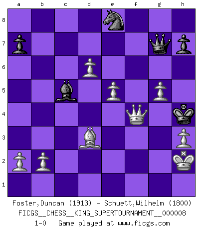 Last move : 1-0 2021 September 30 13:12:32 [Event "FICGS__CHESS__KING_SUPERTOURNAMENT__000008"] [Site "FICGS"] [Date "2021.06.02"] [Round "1"] [White "Foster,Duncan"] [Black "Schuett,Wilhelm"] [Result "1-0"] [WhiteElo "1913"] [BlackElo "1800"] 1.e4 e5 2.f4 exf4 3.Nf3 Nf6 4.e5 Nh5 5.d4 d5 6.Be2 g5 7.O-O Rg8 8.Qd3 Rg6 9.Nh4 Rh6 10.Qd1 Ng7 11.Nf3 Ne6 12.h3 b6 13.c4 Bb7 14.Nc3 dxc4 15.d5 Bc5+ 16.Kh2 Ng7 17.Nxg5 Qxg5 18.Bxf4 Qg6 19.Qa4+ c6 20.Bxh6 Qxh6 21.Rae1 Kf8 22.Bxc4 b5 23.Nxb5 cxb5 24.Qxb5 Qb6 25.Qa4 Kg8 26.d6 Bc6 27.Qc2 Nd7 28.Rxf7 Kh8 29.Re4 Bxe4 30.Qxe4 Qd8 31.Rxd7 Qxd7 32.Qxa8+ Ne8 33.Qd5 Kg7 34.Qg8+ Kh6 35.Qf8+ Kg6 36.Bd3+ Kh5 37.Qf4 Qg7 38.g4+ Kh4 39.g5 1-0 KGA : Schallop defense Kingside Castling by player White (move 7) Player White won this chess game. Follow this game move after move (download)Nowadays, when you're not a grandmaster at 14, you can forget about it. (Anand Viswanathan) Nie in meinem Leben habe ich die französische Verteidigung gespielt, welche die Stumpfsinnigste von allen ist. (Wilhelm Steinitz) Observen a Garry Kasparov. Después de una derrota, invariablemente el gana la próxima partida. Prácticamente hace pedazos a su siguiente oponente. Eso es algo que tenemos que aprender a lograr. (Maurice Ashley) Celui qui prend des risques peut perdre, celui qui n'en prend pas perd toujours. (Xavier Tartacover) However beautiful the strategy, you should occasionally look at the results. (Winston Churchill)