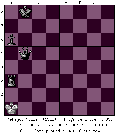 Last move : 0-1 2021 July 14 19:28:50 [Event "FICGS__CHESS__KING_SUPERTOURNAMENT__000008"] [Site "FICGS"] [Date "2021.06.02"] [Round "1"] [White "Kehayov,Yulian"] [Black "Trigance,Emile"] [Result "0-1"] [WhiteElo "1313"] [BlackElo "1739"] 1.e4 e5 2.f4 exf4 3.Nf3 d6 4.d4 g5 5.Bc4 g4 6.Bxf4 gxf3 7.Qxf3 Be6 8.Bxe6 fxe6 9.Nc3 Qh4+ 10.g3 Qf6 11.e5 Qf5 12.O-O-O d5 13.Nb5 Qf7 14.Qc3 Nc6 15.Qb3 a6 16.Nd6+ cxd6 17.exd6 Qd7 18.c3 b5 19.a3 Bxd6 20.Kb1 Bxf4 21.gxf4 Nf6 22.Qc2 O-O-O 23.Rde1 Ne4 24.Rxe4 dxe4 25.Qxe4 Kb8 26.Re1 Rde8 27.Qf3 Rhg8 28.h4 Re7 29.f5 exf5 30.Rxe7 Nxe7 31.Qh5 Qd5 32.Qxh7 Rg1+ 33.Kc2 Qg2+ 34.Kb3 Qg8+ 35.Qxg8+ Rxg8 36.h5 Rh8 37.h6 Rxh6 38.Kb4 Rc6 39.a4 bxa4 40.Kxa4 f4 41.b3 f3 42.c4 f2 43.d5 Nxd5 44.cxd5 Rd6 45.b4 f1Q 46.b5 Qxb5+ 47.Ka3 Rxd5 48.Ka2 Rd3 49.Ka1 Ra3+ 0-1 KGA : Fischer defense Queenside Castling by player White (move 12) Queenside Castling by player Black (move 22) 10 pieces endgame at move 39 : White KPPP , Black KRNPPP WHITE : King + 3 Pawns BLACK : King + 1 Rook 1 Knight 3 Pawns 9 pieces endgame at move 40 : White KPPP , Black KRNPP WHITE : King + 3 Pawns BLACK : King + 1 Rook 1 Knight 2 Pawns 8 pieces endgame at move 43 : White KPP , Black KRNPP WHITE : King + 2 Pawns BLACK : King + 1 Rook 1 Knight 2 Pawns 7 pieces endgame at move 44 : White KPP , Black KRPP WHITE : King + 2 Pawns BLACK : King + 1 Rook 2 Pawns Promotion Queen by player Black (move 45) 6 pieces endgame at move 46 : White KP , Black KQRP WHITE : King + 1 Pawn BLACK : King + 1 Queen 1 Rook 1 Pawn 5 pieces endgame at move 47 : White K , Black KQRP WHITE : King + BLACK : King + 1 Queen 1 Rook 1 Pawn Player Black won this chess game. Follow this game move after move (download)Without error there can be no brilliancy. (Emanuel Lasker) Fischer: 'Remis!?' Uhlmann: 'Aber es muss doch dreimal Zugwiederholung sein!' Fischer: 'Sie nehmen das Remis an, wie ich es sage, sonst spiele ich weiter und werde Sie dann schlagen!' (Robert James Fischer) Jugadores de primera clase pierden en contra de jugadores de segunda clase porque los jugadores de segunda clase a veces juegan una partida de primer clase. (Siegbert Tarrasch) Mais l'homme est une créature légère et illogique : semblable au joueur d'échecs, il n'aime que le processus du but à atteindre, non le but lui-même. (Dostoïevsky) Luck is the residue of design. (John Milton)