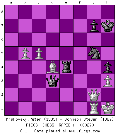 Last move : 0-1 2021 October 28 19:37:34 [Event "FICGS__CHESS__RAPID_A__000270"] [Site "FICGS"] [Date "2021.06.03"] [Round "1"] [White "Krakovsky,Peter"] [Black "Johnson,Steven"] [Result "0-1"] [WhiteElo "1983"] [BlackElo "1967"] 1.e4 c6 2.d4 d5 3.e5 Bf5 4.Nf3 e6 5.Be2 Bg6 6.O-O Nd7 7.Nbd2 Nh6 8.Nb3 Nf5 9.Bd2 c5 10.dxc5 Bxc5 11.Rc1 O-O 12.c4 d4 13.Bf4 Qb6 14.g4 Ne7 15.Nfxd4 Rfd8 16.Qd2 Nb8 17.Nxc5 Qxc5 18.Be3 Nbc6 19.Rcd1 Qxe5 20.f4 Qc7 21.Qc3 Nxd4 22.Bxd4 f6 23.Qe3 Nc6 24.Bc3 e5 25.fxe5 Nxe5 26.g5 Rxd1 27.Rxd1 Re8 28.Qg3 Qb6+ 29.Qf2 Qe6 30.gxf6 Ng4 31.Qd4 Nxf6 32.Bf3 Qc8 33.c5 h6 34.b4 Kh7 35.Rf1 Re7 36.Qd6 Re6 37.Bxb7 Qe8 38.Qd4 Re7 39.Bg2 Be4 40.Qf2 Bxg2 41.Qxg2 Ne4 42.Bb2 a5 43.a3 axb4 44.axb4 Qd7 45.Qf3 Re6 46.Qf5+ Rg6+ 47.Kh1 Qb7 48.Qf3 Qd5 49.b5 Qc4 50.Rg1 Qd3 51.Qf7 Ng5 52.Qb7 Kg8 53.Qa8+ Kh7 54.Qb7 h5 55.Qg2 h4 56.h3 Re6 57.Bd4 Re4 0-1 This chess game has been lost on time (started : 2021.06.03 15:23:24) Caro-Kann : Advance variation Kingside Castling by player White (move 6) Kingside Castling by player Black (move 11) Player Black won this chess game. Follow this game move after move (download)A player surprised is half beaten. (Proverb) Ich bin stolz ein Bulgare zu sein. (Veselin Topalov) Una buena memoria, concentración, imaginación y una fuerte voluntad, se requiere para llegar a ser un buen jugador. (Bobby Fischer) L'action d'une oeuvre littéraire se déroule sur un champ de bataille. Les masques et les types du drame moderne correspondent aux pièces du jeu d'échecs. L'intrigue correspond aux coups et aux gambits, c'est à dire aux techniques du jeu telles qu'utilisées et interprétées par les joueurs. Les tactiques et les péripéties [mouvements] correspondent aux coups exécutés par l'adversaire. (Viktor Shklovsky) An expert is a man who has made all the mistakes which can be made in a very narrow field. (Niels Bohr)