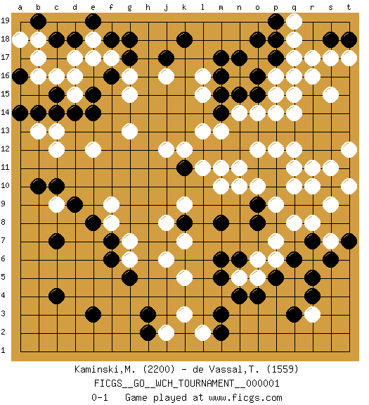 Last move : 0-1 2008 March 22 4:49:19 [Event "FICGS__GO__WCH_TOURNAMENT__000001"] [Site "FICGS"] [Date "2007.07.12"] [Round "1"] [Black "Kaminski,Marek"] [White "de Vassal,Thibault"] [Result "0-1"] [Rating 1 "2200"] [Rating 2 "1559"] 1.q16 d17 2.c4 r3 3.c15 c12 4.g17 d15 5.d14 c16 6.e15 d16 7.e14 o17 8.m17 q14 9.o16 r17 10.p17 r16 11.e3 q8 12.o4 c9 13.b14 c13 14.c14 b16 15.c7 k3 16.h3 l16 17.m16 l15 18.k18 j16 19.j17 l13 20.m3 k5 21.m6 k7 22.m8 k9 23.r4 r6 24.r5 p6 25.q3 g16 26.f16 g15 27.f18 e18 28.r12 r10 29.r15 s15 30.r14 q15 31.s14 t15 32.q13 o14 33.p13 p15 34.o18 q18 35.o13 n14 36.p10 q11 37.p11 m10 38.o8 g13 39.s6 s7 40.r7 r8 41.q6 p9 42.o9 s11 43.t14 s9 44.t7 q10 45.b10 o10 46.o11 n10 47.s16 s17 48.t16 p16 49.n17 q17 50.c10 q12 51.s12 t12 52.t13 r13 53.t11 t10 54.n13 m13 55.m12 n11 56.n12 p12 57.l12 k12 58.k11 l11 59.m14 j12 60.m15 t17 61.s18 o12 62.s13 p14 63.n15 m11 64.r13 q16 65.p18 q19 66.t18 s15 67.t15 r11 68.p19 t12 69.k8 j8 70.t11 j6 71.o15 t12 72.c18 s15 73.d18 e12 74.d9 f9 75.e8 f8 76.f7 g7 77.f6 g6 78.g5 p7 79.p5 o6 80.n6 o5 81.n4 n5 82.m5 l2 83.m2 j2 84.h2 e17 85.e19 f17 86.g18 b13 87.a14 b18 88.b19 a18 89.a16 b17 0-1 This go game has been lost on time (started : 2007.07.12 21:8:8) Here are the names of the openings (joseki) played in the four corners : Corner d16 : d17 c15 Komoku (Somok, Xiao~mu`) 3-4 Point. The komoku (3-4) point is the traditional corner enclosure move.. Ikken Kakari (Hankan Keolch'im, Yi Gua`jiao~, 1-Space Low Pincer). The small knight move is the basic approach move to the 3-4 point stone. It has been continually used for over four centuries. There are limitless variations, with new moves constantly being discovered. Black 2 opens the door to a treaure store of joseki. Corner q16 : q16 o17 Hoshi (Hwajeom, Seongjeom, Xingwei`) 4-4 Point. The star or hoshi (4-4) point, emphasizing influence at the potential expense of territory. Ikken Kakari (Hankan Keolch'im, Yi Gua`jiao~, 1-Space Low Approach). White 2 is the standard approach move to the 4-4. Player White won this Go (weiqi, baduk) game. Follow this game move after move (download)There is death in the hane. (Anonymous) The large trees attract high winds. (Chinese proverb)