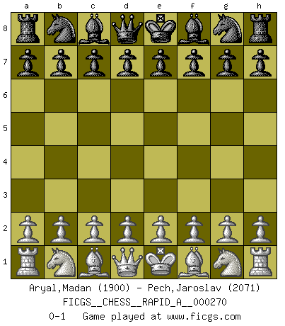Last move : 0-1 2021 July 3 21:44:34 [Event "FICGS__CHESS__RAPID_A__000270"] [Site "FICGS"] [Date "2021.06.03"] [Round "1"] [White "Aryal,Madan"] [Black "Pech,Jaroslav"] [Result "0-1"] [WhiteElo "1900"] [BlackElo "2071"] 0-1 This chess game has been lost on time (started : 2021.06.03 15:23:24) Player Black won this chess game. Follow this game move after move (download)Bobby Fischer is the greatest Chess player who has ever lived. (Ken Smith) Ich würde mich als ganz normalen Jungen bezeichnen [Im Alter von 12]. (Sergej Karjakin) El Ajedrez expande y enriquece tu mente. (Saudin Robovic) Ne tendez aucun piège pour le plaisir ! Ne jouez rien dans l'espoir que l'adversaire réagisse de façon stupide ! Prenez toujours pour acquis que l'adversaire va trouver le meilleur coup ! Ne jouez jamais de coup dans l'espoir que l'adversaire ne voie pas la menace ! Chacun de vos coups doit améliorer la position d'une façon ou d'une autre. It is a good thing for an uneducated man to read books of quotations. (Winston Churchill)