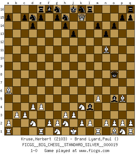 Last move : 1-0 2021 June 17 1:29:21 [Event "FICGS__BIG_CHESS__STANDARD_SILVER__000019"] [Site "FICGS"] [Date "2021.06.04"] [Round "1"] [White "Kruse,Herbert"] [Black "Brand Lyard,Paul"] [Result "1-0"] [WhiteElo "2103"] [BlackElo ""] 1.j2-k4 j15-k13 2.h1-o7 p16-q14 3.o7-f15 e16-d16 4.f15-o7 d15-d14 5.d2-d4 o15-o14 6.m2-m4 n15-n13 7.l1-p5 o16-d6 8.e2-e4 d6-h2 9.k1-h2 q14-o13 10.o7-o13 m15-m14 11.o13-j8 c16-n6 12.m4-m5 n6-o5 13.c1-l9 d16-e16 14.j8-b15 b16-d15 15.b15-g10 a16-b16 16.b2-b3 b16-b4 17.c2-c3 b4-b6 18.b1-d2 l16-q11 19.g10-g11 q11-k5 20.g11-b6 j14-j13 21.b6-k6 k5-l4 22.k6-k13 h16-q8 23.f1-a6 q8-o8 24.k13-k15 j16-h16 25.k15-l15 m16-l16 26.l9-n11 h16-j16 27.l15-k15 1-0 Follow this game move after move (download)Chess is the art which expresses the science of logic. (Mikhail Botvinnik) Alles was ich jemals tun will ist Schach spielen. (Robert James Fischer) No es tiempo de jugar al Ajedrez cuando la casa esta en llamas. (Proverbio Italiano) L'action d'une oeuvre littéraire se déroule sur un champ de bataille. Les masques et les types du drame moderne correspondent aux pièces du jeu d'échecs. L'intrigue correspond aux coups et aux gambits, c'est à dire aux techniques du jeu telles qu'utilisées et interprétées par les joueurs. Les tactiques et les péripéties [mouvements] correspondent aux coups exécutés par l'adversaire. (Viktor Shklovsky) Some people are so afraid to die that they never begin to live. (Henry Van Dyke)