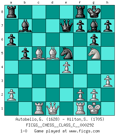 Last move : 1-0 2021 September 9 0:27:48 [Event "FICGS__CHESS__CLASS_C__000292"] [Site "FICGS"] [Date "2021.06.06"] [Round "1"] [White "Autobello,Giovanni"] [Black "Hilton,Stephen"] [Result "1-0"] [WhiteElo "1628"] [BlackElo "1705"] 1.d4 Nf6 2.c4 g6 3.Nc3 d5 4.cxd5 Nxd5 5.e4 Nxc3 6.bxc3 Bg7 7.Bc4 O-O 8.Nf3 c5 9.Be3 cxd4 10.cxd4 Nc6 11.h3 a6 12.O-O e6 13.Rb1 b5 14.Bb3 Bb7 15.d5 exd5 16.Bxd5 Qd7 17.Ng5 Qe7 18.Rc1 Ne5 19.Bc5 1-0 King's Indian defense, 3.Nc3 Kingside Castling by player Black (move 7) Kingside Castling by player White (move 12) Player White won this chess game. Follow this game move after move (download)Only the player with the initiative has the right to attack. (Wilhelm Steinitz) Wie gewinnt Tal? Er entwickelt alle seine Figuren in die Brettmitte und opfert sie dann irgendwo. (Robert James Fischer) No volvere nunca a jugar contigo. Has insultado a mi amigo. - cuando un oponente se maldijo por una mala jugada (Miguel Najdorf) Les Echecs ont trois composantes : le temps, l'espace et le matériel en dernier. (Mikhail Tal) If you work for a living, why do you kill yourself working ? (Tuco to a chicken in The Good, The Bad and The Ugly)