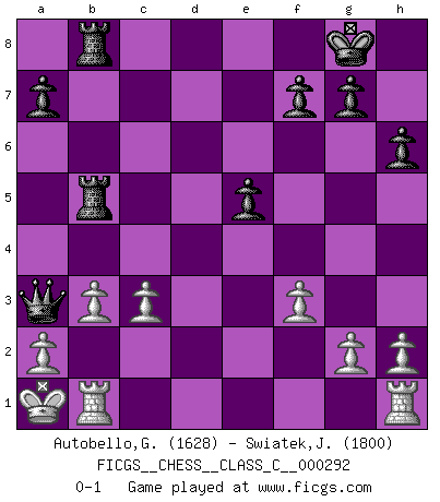 Last move : 0-1 2021 October 13 14:4:47 [Event "FICGS__CHESS__CLASS_C__000292"] [Site "FICGS"] [Date "2021.06.06"] [Round "1"] [White "Autobello,Giovanni"] [Black "Swiatek,Janusz"] [Result "0-1"] [WhiteElo "1628"] [BlackElo "1800"] 1.e4 c5 2.Nf3 e6 3.d4 cxd4 4.Nxd4 Nf6 5.Nc3 Nc6 6.Be3 Bb4 7.f3 d5 8.Nxc6 bxc6 9.Qd3 O-O 10.O-O-O Qc7 11.Bg5 h6 12.Bxf6 Qf4+ 13.Kb1 Qxf6 14.exd5 cxd5 15.Qd4 Qe7 16.Bd3 Rb8 17.Ka1 e5 18.Qxd5 Bxc3 19.bxc3 Qa3 20.Bb5 Be6 21.Qb3 Bxb3 22.cxb3 Rxb5 23.Rb1 Rfb8 0-1 Sicilian : Anderssen variation Kingside Castling by player Black (move 9) Queenside Castling by player White (move 10) Player Black won this chess game. Follow this game move after move (download)In Fischer's hands, a slight theoretical advantage is as good a being a Queen ahead. (Isaac Kashdan) Ich kenne keine einzige Person, die behaupten würde, Garri Kasparow sei ein guter Mensch (Nigel Short) Prefiero perder una partida realmente buena, que ganar una mala. (David Levy) Il vaut toujours mieux jouer un plan faux de façon logique que de n'avoir pas de plan du tout. (Victor Kortchnoï) The mind is like a parachute, it only functions when its open. (Unknown)