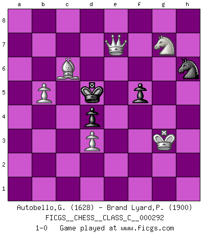 Last move : 1-0 2021 October 18 8:14:0 [Event "FICGS__CHESS__CLASS_C__000292"] [Site "FICGS"] [Date "2021.06.06"] [Round "1"] [White "Autobello,Giovanni"] [Black "Brand Lyard,Paul"] [Result "1-0"] [WhiteElo "1628"] [BlackElo "1900"] 1.c4 e5 2.Nc3 Nf6 3.Nf3 Nc6 4.g3 d6 5.Bg2 Ng4 6.O-O h5 7.h3 Nf6 8.d3 g5 9.Bxg5 Bh6 10.Bxh6 Rxh6 11.a3 a5 12.Rb1 Bf5 13.b4 axb4 14.axb4 Qe7 15.b5 Nd4 16.Nxd4 exd4 17.Bxb7 Ra7 18.Bc6+ Kf8 19.Nd5 Qe6 20.Nf4 Qe7 21.Ra1 Rxa1 22.Qxa1 Qe5 23.Qa8+ Kg7 24.Qd8 Bxh3 25.Nxh3 Qxe2 26.Qxc7 Rg6 27.Nf4 Rxg3+ 28.fxg3 Qg4 29.Kg2 h4 30.Rf3 hxg3 31.Rxg3 Qxg3+ 32.Kxg3 d5 33.cxd5 Ng8 34.Be8 Nh6 35.Ne6+ Kf6 36.Qd8+ Ke5 37.Ng7 f5 38.Qe7+ Kxd5 39.Bc6+ 1-0 English Opening Kingside Castling by player White (move 6) 10 pieces endgame at move 38 : White KQBNPP , Black KNPP WHITE : King + 1 Queen 1 Bishop 1 Knight 2 Pawns BLACK : King + 1 Knight 2 Pawns Player White won this chess game. Follow this game move after move (download)A man without frontiers. He didn't divide the East and the West, he brought them together in their admiration for him. (Ljubomir Ljubojevic, about Bobby Fischer's death) Warum muß ich gegen diesen IDIOTEN verlieren? (Aaron Nimzowitsch) El Ajedrez moderno está demasiado preocupado con cosas como la estructura de Peones. Olvidenlo, el Jaque Mate termina la partida. (Nigel Short) Les échecs, c'est l'art d'analyser. (Mikhail Botvinnik) The existence of forgetting has never been proved: We only know that some things don't come to mind when we want them. (Friedrich Nietzsche)