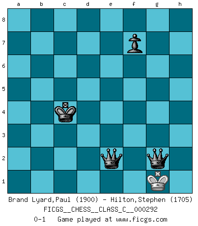 Last move : 0-1 2021 August 31 22:12:39 [Event "FICGS__CHESS__CLASS_C__000292"] [Site "FICGS"] [Date "2021.06.06"] [Round "1"] [White "Brand Lyard,Paul"] [Black "Hilton,Stephen"] [Result "0-1"] [WhiteElo "1900"] [BlackElo "1705"] 1.e4 c6 2.d4 d5 3.e5 Bf5 4.Nf3 e6 5.Bd3 Bxd3 6.cxd3 Nd7 7.Ng5 h6 8.Nf3 Ne7 9.O-O Ng6 10.Re1 Qb6 11.Qb3 Qxb3 12.axb3 Bb4 13.Bd2 Bxd2 14.Nbxd2 O-O 15.h3 c5 16.dxc5 Nxc5 17.Re3 Rfc8 18.b4 Nd7 19.d4 Rc2 20.b3 a6 21.g4 Rac8 22.Kg2 Nf4+ 23.Kg3 g5 24.h4 Nf8 25.hxg5 hxg5 26.Rd1 Ne2+ 27.Rxe2 R8c3 28.Re3 Rc7 29.Nxg5 Ng6 30.Rb1 Rxd2 31.f4 R7c2 32.Nf3 Rg2+ 33.Kh3 Nxf4+ 34.Kh4 Rce2 35.Rxe2 Rxe2 36.Kg3 Ng6 37.Ng5 Rd2 38.Nf3 Rd3 39.g5 Kg7 40.Kg4 Rc3 41.Kg3 Ne7 42.Kf4 Nc6 43.b5 axb5 44.b4 Rc4 45.Kg4 Nxd4 46.Nxd4 Rxd4+ 47.Kf3 Kg6 48.Ke3 Rc4 49.Kd3 Kxg5 50.Rf1 Rf4 51.Rg1+ Kf5 52.Rg7 Kxe5 53.Rg5+ Rf5 54.Rg7 Kd6 55.Kd4 e5+ 56.Ke3 d4+ 57.Kd3 Kd5 58.Rg8 e4+ 59.Kd2 Kc4 60.Rb8 Kxb4 61.Rxb7 Kc5 62.Ra7 Kc4 63.Rc7+ Kd5 64.Rd7+ Kc5 65.Rc7+ Kd6 66.Rb7 Rf2+ 67.Ke1 Rf5 68.Rb6+ Kc5 69.Rb8 d3 70.Kd2 Kc4 71.Rc8+ Kb4 72.Rc1 Rc5 73.Rxc5 Kxc5 74.Ke3 Kc4 75.Kxe4 d2 76.Ke5 d1Q 77.Kf6 Qd7 78.Ke5 b4 79.Ke4 b3 80.Ke3 b2 81.Kf3 b1Q 82.Kf4 Qd7f5+ 83.Kg3 Qb1d3+ 84.Kg2 Qf5f3+ 85.Kh2 Qd3e2+ 86.Kg1 Qf3g2+ 0-1 Caro-Kann : Advance variation Kingside Castling by player White (move 9) Kingside Castling by player Black (move 14) 10 pieces endgame at move 52 : White KRP , Black KRPPPPP WHITE : King + 1 Rook 1 Pawn BLACK : King + 1 Rook 5 Pawns 9 pieces endgame at move 60 : White KR , Black KRPPPPP WHITE : King + 1 Rook BLACK : King + 1 Rook 5 Pawns 8 pieces endgame at move 61 : White KR , Black KRPPPP WHITE : King + 1 Rook BLACK : King + 1 Rook 4 Pawns 7 pieces endgame at move 73 : White KR , Black KPPPP WHITE : King + 1 Rook BLACK : King + 4 Pawns 6 pieces endgame at move 73 : White K , Black KPPPP WHITE : King + BLACK : King + 4 Pawns 5 pieces endgame at move 75 : White K , Black KPPP WHITE : King + BLACK : King + 3 Pawns Promotion Queen by player Black (move 76) Promotion Queen by player Black (move 81) Player Black won this chess game. Follow this game move after move (download)Only sissies Castle. (Rob Sillars) Über Karpov: Er war und ist ein Vertreter der russischen Reaktionäre. Das steckt tief in seiner Seele, wehalb ich nicht nett mit ihm umgehen kann. (Viktor Kortschnoi) El Ajedrez no es como la vida... ¡tiene reglas!. (Mark Pasternak) Des combinaisons [dans le jeu d'échecs] pareilles à des mélodies. Je crois entendre pour ainsi dire la musique des coups... (Vladimir Nabokov) Luck never gives; it only lends. (Swedish proverb)