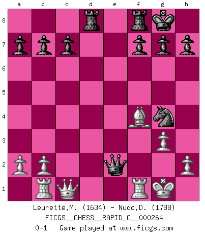 Last move : 0-1 2021 July 6 9:42:28 [Event "FICGS__CHESS__RAPID_C__000264"] [Site "FICGS"] [Date "2021.06.06"] [Round "1"] [White "Leurette,Marc-Antoine"] [Black "Nudo,Davide"] [Result "0-1"] [WhiteElo "1634"] [BlackElo "1788"] 1.e4 e5 2.Nf3 Nc6 3.Bc4 Bc5 4.c3 Nf6 5.d4 exd4 6.e5 d5 7.Bb5 Ne4 8.cxd4 Bb6 9.Nc3 O-O 10.O-O Bg4 11.Be2 Bxf3 12.Bxf3 Bxd4 13.Nxe4 dxe4 14.Bxe4 Nxe5 15.Rb1 Bxf2+ 16.Kxf2 Qh4+ 17.g3 Qxe4 18.Bf4 Rad8 19.Qc1 Ng4+ 20.Kg1 Qe2 0-1 Giuoco Piano Kingside Castling by player Black (move 9) Kingside Castling by player White (move 10) Player Black won this chess game. Follow this game move after move (download)It is no time to be playing Chess when the house is on fire. (Italian Proverb) Charakterschwächen offenbaren sich normalerweise während einer Schachpartie. (Garry Kasparov) Aún el Rey más flojo huye despavorido ante la amenaza de un Jaque doble. (Aaron Nimzowitsch) Ce qui caractérise les parties de combat, c'est que si le défenseur a constamment de difficiles problèmes à résoudre, l'attaquant doit chercher sans relâche de nouvelles possibilités d'attaque. (Koblentz) Any activity becomes creative when the doer cares about doing it right or doing it better. (John Updike)
