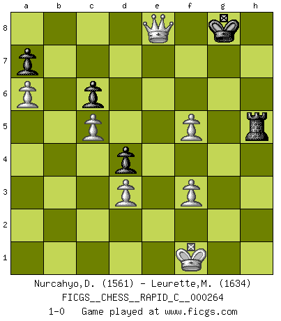 Last move : 1-0 2021 August 6 8:42:50 [Event "FICGS__CHESS__RAPID_C__000264"] [Site "FICGS"] [Date "2021.06.06"] [Round "1"] [White "Nurcahyo,Dery"] [Black "Leurette,Marc-Antoine"] [Result "1-0"] [WhiteElo "1561"] [BlackElo "1634"] 1.e4 e5 2.Nf3 Nc6 3.c3 Nf6 4.Qc2 d6 5.Bc4 Be7 6.O-O b6 7.Ng5 h6 8.Nxf7 Qd7 9.Nxh8 Bb7 10.Ng6 Qg4 11.Nh8 Kd7 12.f3 Qh4 13.d3 Rxh8 14.Be3 Nh5 15.Bf2 Qg5 16.Nd2 Nf4 17.Bg3 Nh5 18.Bf2 Nf4 19.g3 Nh3+ 20.Kh1 h5 21.Rae1 Nxf2+ 22.Rxf2 h4 23.Rg2 hxg3 24.Reg1 Rh3 25.Nf1 Qh6 26.Nxg3 g6 27.a4 Nd8 28.Qe2 Ne6 29.Bxe6+ Kxe6 30.Nf1 g5 31.Rg3 Rh5 32.b4 Bd8 33.Ne3 Kf7 34.Ng4 Qg7 35.Qa2+ Ke7 36.Ne3 Bc8 37.Kg2 Qh7 38.Nf1 Bh3+ 39.Kh1 Kf8 40.Qf2 Bd7 41.a5 Kg7 42.Ne3 Be6 43.Ng4 c6 44.a6 Kg6 45.c4 Qg7 46.Kg2 Bc7 47.Kf1 Kf7 48.Ke2 Bd8 49.R1g2 Kg6 50.Ne3 Kh6 51.Nf5+ Bxf5 52.exf5 Bf6 53.c5 bxc5 54.bxc5 d5 55.Rg4 d4 56.h4 Qg8 57.hxg5+ Bxg5 58.Rxg5 Rxg5 59.Qh4+ Rh5 60.Qf6+ Kh7 61.Rxg8 Rh2+ 62.Kf1 Kxg8 63.Qxe5 Rh5 64.Qe8+ 1-0 Ponziani : Jaenisch counter-attack Kingside Castling by player White (move 6) Player White won this chess game. Follow this game move after move (download)Nowadays, when you're not a grandmaster at 14, you can forget about it. (Anand Viswanathan) Ich verlor meine Bürgerrechte, mein Gehalt wurde mir nicht mehr bezahlt und ich wurde zensiert und durfte nicht mehr ins Ausland reisen. [nach dem Match Fischer-Taimanov 6:0] (Mark Taimanov) Realmente no sabemos como el juego fue inventado, aunque hay sospechas. Tan pronto como descubramos a los culpables, se los haremos saber. (Bruce Pandolfini) Les Echecs ont trois composantes : le temps, l'espace et le matériel en dernier. (Mikhail Tal) Everything in life is luck. (Donald Trump)