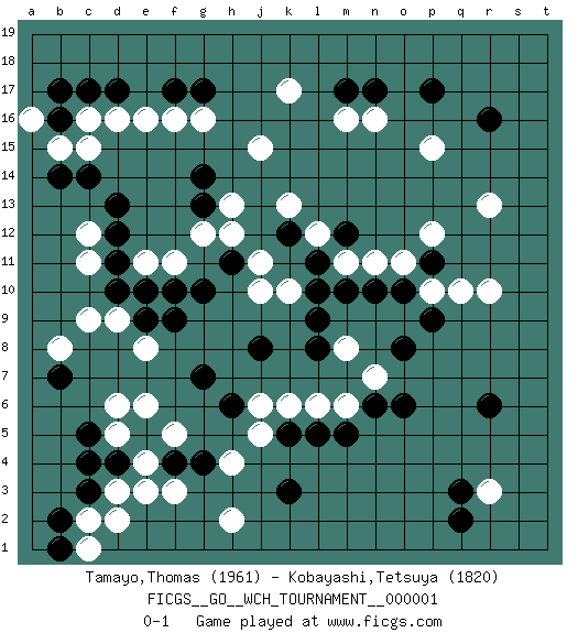 Last move : 0-1 2007 December 9 8:31:48 [Event "FICGS__GO__WCH_TOURNAMENT__000001"] [Site "FICGS"] [Date "2007.07.12"] [Round "1"] [Black "Tamayo,Thomas"] [White "Kobayashi,Tetsuya"] [Result "0-1"] [Rating 1 "1961"] [Rating 2 "1820"] 1.r16 d16 2.p17 d3 3.q3 r10 4.r6 r13 5.c5 d9 6.f4 d5 7.d4 e4 8.c4 e3 9.e5 d6 10.c3 f3 11.g4 h2 12.b7 c2 13.b2 e6 14.k3 f5 15.k5 k17 16.c14 c12 17.c17 c16 18.d17 e16 19.b16 b15 20.b17 c15 21.f17 f16 22.g17 g16 23.b14 a16 24.d10 c9 25.d12 c11 26.d13 g12 27.d11 b8 28.g13 h13 29.g14 j15 30.g10 j10 31.e9 e8 32.f9 f11 33.h11 h12 34.f10 e11 35.e10 j11 36.g7 j6 37.h6 j5 38.j8 k6 39.l8 h4 40.l5 l6 41.m5 m6 42.n6 n7 43.o6 m8 44.l9 m11 45.m10 n11 46.l11 k10 47.l10 l12 48.k12 k13 49.n10 o11 50.o10 p10 51.p9 r3 52.q2 c1 53.b1 d2 54.o8 p15 55.m17 m16 56.n17 n16 57.p11 q10 58.m12 p12 0-1 This go game has been lost on time (started : 2007.07.12 21:8:8) Here are the names of the openings (joseki) played in the four corners : Corner d4 : d3 c5 Komoku (Somok, Xiao~mu`) 3-4 Point. The komoku (3-4) point is the traditional corner enclosure move.. Ikken Kakari (Hankan Keolch'im, Yi Gua`jiao~, 1-Space Low Pincer). The small knight move is the basic approach move to the 3-4 point stone. It has been continually used for over four centuries. There are limitless variations, with new moves constantly being discovered. Black 2 opens the door to a treaure store of joseki. Corner d16 : d16 c14 Hoshi (Hwajeom, Seongjeom, Xingwei`) 4-4 Point. The star or hoshi (4-4) point, emphasizing influence at the potential expense of territory. Ikken Kakari (Hankan Keolch'im, Yi Gua`jiao~, 1-Space Low Approach). Black 2 is the standard approach move to the 4-4. Player White won this Go (weiqi, baduk) game. Follow this game move after move (download)The weak player fears ko, the strong player seeks it. (Bill Taylor) The real danger is not that computers will begin to think like men, but that men will begin to think like computers. (Sydney J. Harris)