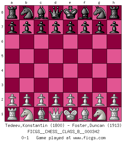 Last move : 0-1 2021 July 16 21:4:33 [Event "FICGS__CHESS__CLASS_B__000342"] [Site "FICGS"] [Date "2021.06.06"] [Round "1"] [White "Tedeev,Konstantin"] [Black "Foster,Duncan"] [Result "0-1"] [WhiteElo "1800"] [BlackElo "1913"] 0-1 This chess game has been lost on time (started : 2021.06.06 19:48:17) Player Black won this chess game. Follow this game move after move (download)Chess demands total concentration. (Bobby Fischer) Im Schach gewinnt jeder. Hat man Freunde am Spiel - und das ist die Hauptsache - ist auch der Verlust einer Partie kein Unglück. (David Bronstein) Aún deseo matar a Fischer. (Boris Spassky) Toutes les manuvres exécutées sur une colonne ouverte ont pour but ultime l'intrusion définitive sur la septième ou la huitième rangée, en plein cur de la position ennemie. (Aaron Nimzovitch) Fame, I have already. Now I need the money. (an elderly Steinitz)