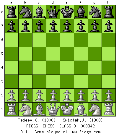 Last move : 0-1 2021 July 16 21:4:33 [Event "FICGS__CHESS__CLASS_B__000342"] [Site "FICGS"] [Date "2021.06.06"] [Round "1"] [White "Tedeev,Konstantin"] [Black "Swiatek,Janusz"] [Result "0-1"] [WhiteElo "1800"] [BlackElo "1800"] 0-1 This chess game has been lost on time (started : 2021.06.06 19:48:17) Player Black won this chess game. Follow this game move after move (download)There must have been a time when men were demigods, or they could not have invented Chess. (Gustav Schenk) Wenn du nicht weißt was du tun sollst, warte bis dein Gegner eine Idee hat. Sie wird sicher schlecht sein. (Siegbert Tarrasch) Un Peón pasado aumenta su poder a medida de que el número de piezas en el tablero disminuye. (Capablanca) Aux échecs, l'amour-propre est satisfait quand on remporte la victoire, mais il n'y a pas de honte à être battu. (Benjamin Franklin) Tomorrow's what you make of it. (Horatio Caine, C.S.I. Miami)