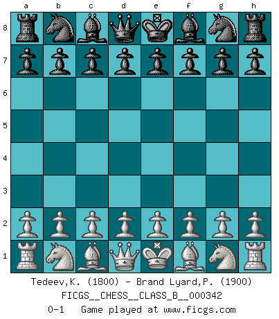 Last move : 0-1 2021 July 16 21:4:33 [Event "FICGS__CHESS__CLASS_B__000342"] [Site "FICGS"] [Date "2021.06.06"] [Round "1"] [White "Tedeev,Konstantin"] [Black "Brand Lyard,Paul"] [Result "0-1"] [WhiteElo "1800"] [BlackElo "1900"] 0-1 This chess game has been lost on time (started : 2021.06.06 19:48:17) Player Black won this chess game. Follow this game move after move (download)By playing at Chess then, we may learn: First: Foresight... Second: Circumspection... Third: Caution... And lastly, we learn by Chess the habit of not being discouraged by present bad appearances in the state of our affairs, the habit of hoping for a favorable chance, and that of persevering in the secrets of resources. (Benjamin Franklin) Ein Großmeister muß tausende Partien in seinem Kopf speichern, denn diese sind für Ihn, was die Worte der Muttersprache für gewöhnliche Leute sind, oder Noten für Musiker... (Garry Kasparov) La vida es como el Ajedrez, con lucha, competición y eventos buenos y malos. (Benjamin Franklin) Si je n'étais pas joueur d'échecs, je serais le meilleur dans quelque chose d'autre. (Anatoli Karpov) Nowadays, anyone who cannot speak English and is incapable of using the Internet is regarded as backward. (Al-Waleed bin Talal)