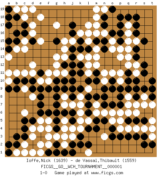 Last move : 1-0 2007 September 27 2:8:35 [Event "FICGS__GO__WCH_TOURNAMENT__000001"] [Site "FICGS"] [Date "2007.07.12"] [Round "1"] [Black "Ioffe,Nick"] [White "de Vassal,Thibault"] [Result "1-0"] [Rating 1 "1639"] [Rating 2 "1559"] 1.r16 d17 2.q3 d3 3.d5 d8 4.g5 f3 5.c3 h3 6.k3 c2 7.d2 e2 8.b2 d1 9.c4 c6 10.p16 d12 11.q10 l17 12.j16 l15 13.j14 l13 14.j12 l11 15.j10 l9 16.j8 o17 17.p17 o18 18.d15 g17 19.g15 q6 20.r5 o6 21.o4 r6 22.s5 r9 23.r10 f5 24.e6 c14 25.c17 d16 26.c16 c15 27.d18 e18 28.b18 e15 29.b15 b14 30.b16 p13 31.r13 o15 32.d10 f8 33.f6 c9 34.c10 e10 35.e11 d11 36.e9 f10 37.d9 f11 38.e8 c11 39.b10 o11 40.n8 m6 41.m4 o9 42.n7 o8 43.l8 m7 44.m8 f7 45.f9 h11 46.j11 h13 47.j13 h14 48.g9 j15 49.k15 h15 50.l14 m14 51.k14 n6 52.k9 k16 53.q9 h5 54.g4 h4 55.h6 s8 56.p7 p6 57.o7 q8 58.p8 s10 59.s11 q7 60.t10 k6 61.j6 k5 62.g2 g3 63.j2 k4 64.l4 f4 65.g6 h2 66.h1 j3 67.l2 l12 68.m15 l16 69.o16 n16 70.n14 m13 71.n15 o14 72.n17 m16 73.n18 m18 74.p18 m17 75.o19 k7 76.s9 k8 77.p9 b11 78.e7 j7 79.j5 j4 80.r8 s7 81.f1 f2 82.g1 e1 83.j1 k10 84.j9 e4 85.o10 d4 86.c5 n10 87.n9 b1 88.b3 q14 89.r14 h7 90.g10 g11 91.g7 h8 92.g8 p11 93.m10 n11 94.l10 q15 95.k11 d19 96.j17 c18 97.a17 b19 98.a15 r15 99.s15 q16 100.r17 q17 101.q18 p4 102.p3 q4 103.r3 r4 104.a18 s4 105.s3 t3 106.t2 t4 107.s2 a10 108.a9 a11 109.b9 q12 110.h12 g12 111.a14 r12 112.s12 a13 113.m11 o5 114.n5 m12 115.p15 p14 116.m5 l5 117.l7 l1 118.k2 n3 119.o3 p10 120.o9 r7 121.r9 q13 122.t8 t7 123.q5 p5 124.l6 t5 125.t9 m19 126.a2 n19 127.r18 r11 128.q11 e5 129.h10 g13 130.a19 c19 131.a1 c1 132.k12 k13 133.h9 1-0 Comment by player 2 : Thibault de Vassal : According to FICGS scorer B+9,5 .. I lose this game but I feel lucky anyway :) Thanks for the nice game ! Here are the names of the openings (joseki) played in the four corners : Corner d4 : d3 d5 Komoku (Somok, Xiao~mu`) 3-4 Point. The komoku (3-4) point is the traditional corner enclosure move.. Ikken Takagakari (Hankan Nop'dakeolch'im, Yi Gaogua`jiao~, 1-Space High Approach). The 5-4 approach move has become more popular in modern times, as modern Go emphasizes speed and influence. Corner q4 : q3 l9 Komoku (Somok, Xiao~mu`) 3-4 Point. The komoku (3-4) point is the traditional corner enclosure move.. Player Black won this Go (weiqi, baduk) game. Follow this game move after move (download)Never try to cut bamboo joints. (Anonymous) Everybody lies. (Gregory House, House M.D.)