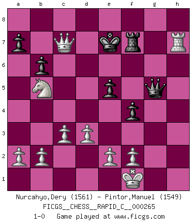 Last move : 1-0 2021 July 22 0:3:26 [Event "FICGS__CHESS__RAPID_C__000265"] [Site "FICGS"] [Date "2021.06.10"] [Round "1"] [White "Nurcahyo,Dery"] [Black "Pintor,Manuel"] [Result "1-0"] [WhiteElo "1561"] [BlackElo "1549"] 1.g3 e5 2.Bg2 Nc6 3.c3 Bc5 4.Nf3 Qf6 5.d3 d6 6.Bg5 Qg6 7.O-O Bg4 8.Be3 Bb6 9.h3 Be6 10.Qa4 Nge7 11.Nh4 Qf6 12.Bxb6 cxb6 13.Nd2 O-O 14.Ne4 Qh6 15.Nxd6 g5 16.Nf3 f6 17.Nxb7 Bxh3 18.Nd6 g4 19.Nh4 f5 20.Qc4+ Kg7 21.Bxh3 gxh3 22.Nb5 f4 23.Kh2 Nf5 24.Kxh3 Rac8 25.Qe4 Rce8 26.Rh1 Nxh4 27.gxh4 Re6 28.Rag1+ Rg6 29.Rxg6+ hxg6 30.Kg2 g5 31.hxg5 Qxg5+ 32.Kf1 Kf6 33.Qxc6+ Ke7 34.Rh7+ Rf7 35.Qc7+ 1-0 Benko's Opening Kingside Castling by player White (move 7) Kingside Castling by player Black (move 13) Player White won this chess game. Follow this game move after move (download)Of all my Russian books, the defense contains and diffuses the greatest 'warmth' which may seem odd seeing how supremely abstract Chess is supposed to be. (Vladimir Nabokov) Der Traum, für den ich lebe, ist der von einem freien Russland. Viele mögen sagen: Russland hat doch ein Parlament, einen gewählten Präsidenten. Aber ich spüre, dass in meiner Heimat die Angst wiederkehrt. Eine Angst, sich frei zu äußern, bestimmte Dinge zu tun (Garry Kasparov) El Ajedrez es parte de la cultura, y si una cultura esta en decadencia, entonces también el Ajedrez declinará. (Mikhail Botvinnik) Les Echecs mettent en conflit, non pas deux intelligences, mais deux volontés. (Lasker) As a goal marker shodan is important. As a destination it is a poor place to stop. (Thomas Tamayo)