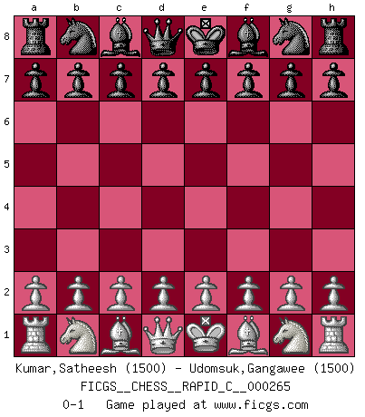 Last move : 0-1 2021 July 10 6:51:36 [Event "FICGS__CHESS__RAPID_C__000265"] [Site "FICGS"] [Date "2021.06.10"] [Round "1"] [White "Kumar,Satheesh"] [Black "Udomsuk,Gangawee"] [Result "0-1"] [WhiteElo "1500"] [BlackElo "1500"] 0-1 This chess game has been lost on time (started : 2021.06.10 4:5:20) Player Black won this chess game. Follow this game move after move (download)The isolated Pawn casts gloom over the entire chessboard. (Aaron Nimzovich) Es gibt nur zwei wahre Schachgenies - das andere war Wilhelm Steinitz, der Weltmeister von 1872 bis 1894. (Robert James Fischer) Fischer era un maestro de claridad y un Rey del posicionamiento astuto. Sus oponentes podían ver hacia donde se dirigía pero eran impotentes para detenerlo. (Bruce Pandolfini) C'est une question de caractère, Beaucoup de gens perdent leur motivation très vite. D'autres, ils sont rares, peuvent la conserver très longtemps. J'aime les échecs, encore aujourd'hui je suis heureux d'analyser des parties. J'aime toujours gagner, je déteste encore perdre. Bien jouer est important pour mon intégrité intellectuelle et morale. Et puis les échecs vivent en ce moment une période historique grâce à Internet. Ils se développent dans les systèmes éducatifs à travers le monde. Ils sortent de leur ghetto, et c'est mon rôle de mener à bien cette révolution. (Gary Kasparov) Fame, I have already. Now I need the money. (an elderly Steinitz)