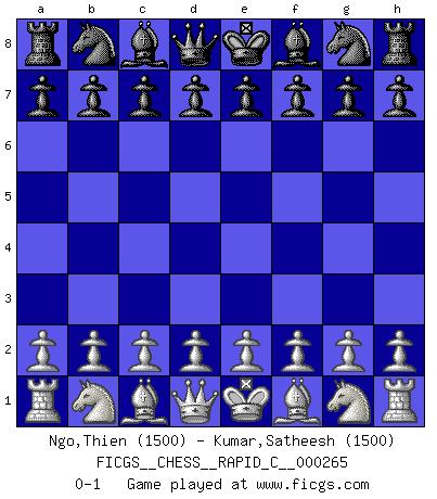 Last move : 0-1 2021 July 10 6:51:36 [Event "FICGS__CHESS__RAPID_C__000265"] [Site "FICGS"] [Date "2021.06.10"] [Round "1"] [White "Ngo,Thien"] [Black "Kumar,Satheesh"] [Result "0-1"] [WhiteElo "1500"] [BlackElo "1500"] 0-1 This chess game has been lost on time (started : 2021.06.10 4:5:20) Player Black won this chess game. Follow this game move after move (download)I am still a victim of Chess. It has all the beauty of art and much more. It cannot be commercialized. Chess is much purer than art in its social position. (Marcel Duchamp) Ich hatte meine größten Erfolge, als ich 47 Jahre alt war. Kasparow war noch nicht mal 42 und hat das Schach schon im Stich gelassen. (Viktor Kortschnoi) Bobby es la celebridad menos entendida y malinterpretada que camina el la faz de esta tierra. (Yasser Seirawan) Shah mat. Le roi est mort. Cri de fierté d'un joueur venant de terrasser son adversaire, courtoisement, sans effusion de sang. The Internet is the first thing that humanity has build that humanity doesn't understand, the largest experiment in anarchy that we have ever had. (Eric Schmidt)