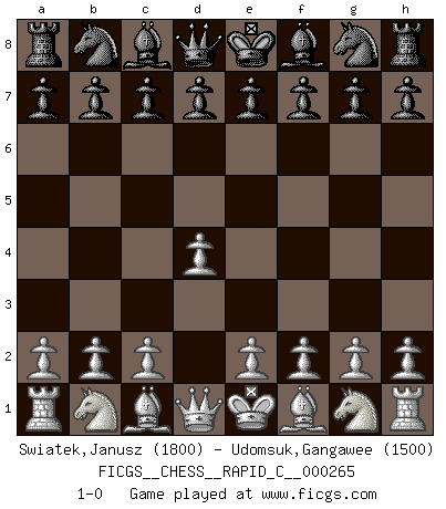 Last move : 1-0 2021 July 10 19:48:50 [Event "FICGS__CHESS__RAPID_C__000265"] [Site "FICGS"] [Date "2021.06.10"] [Round "1"] [White "Swiatek,Janusz"] [Black "Udomsuk,Gangawee"] [Result "1-0"] [WhiteElo "1800"] [BlackElo "1500"] 1.d4 1-0 This chess game has been lost on time (started : 2021.06.10 4:5:20) Queen's pawn Player White won this chess game. Follow this game move after move (download)You know, comrade Pachman, I don't enjoy being a Minister, I would rather play Chess like you. (Che Guevara) Ich habe die Schachforschung dermaßen betrieben, dass sie auf eine wissenschaftliche Basis gestellt wurde. (Mikhail Moiseyevich Botvinik) No hay precio que sea tan grande por la cabellera del Rey enemigo. (Koblentz) La solitude du joueur d'Echecs à l'approche du mat est semblable à celle du condamné. (Francis Szpiner) In fact if nothing is done against this teddy bear, hereby I announce that I would quit chess, rapid chess, blitz chess, postal chess, email chess, server chess and correspondence chess I will then switch to a table game where teddy bears aren't going to be seen for a while, like Poker, or Roulette, all 18+ games. (Elmer Valderrama)