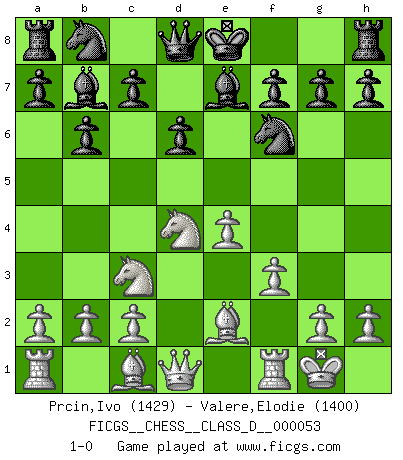 Last move : 1-0 2007 September 4 19:7:57 [Event "FICGS__CHESS__CLASS_D__000053"] [Site "FICGS"] [Date "2007.07.13"] [Round "1"] [White "Prcin,Ivo"] [Black "Valere,Elodie"] [Result "1-0"] [WhiteElo "1429"] [BlackElo "1400"] 1.e4 e5 2.Nf3 b6 3.Nc3 d6 4.d4 exd4 5.Nxd4 Nf6 6.Be2 Bb7 7.f3 Be7 8.O-O 1-0 This chess game has been lost on time (started : 2007.07.13 17:41:50) King's knight Opening Kingside Castling by player White (move 8) Player White won this chess game. Follow this game move after move (download)Chess is life. (Bobby Fischer) Glücklicherweise sind Großmeister Ruben Fines reine Schachbücher weniger phallozentrisch [als seine Schachpsychologie] und deswegen auch weniger lächerlich. (Nigel Short) Si yo gano un torneo, yo lo gano por mí mismo. Yo hago las jugadas. Nadie me ayuda. (Bobby Fischer) Karpov est une pièce de musée. (Garry Kasparov) Logic : The art of thinking and reasoning in strict accordance with the limitations and incapacities of the human misunderstanding. (Ambrose Bierce)