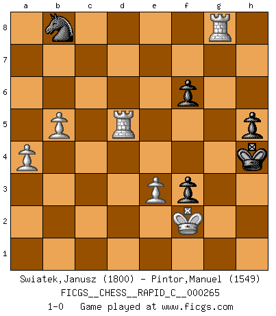 Last move : 1-0 2021 June 28 15:37:11 [Event "FICGS__CHESS__RAPID_C__000265"] [Site "FICGS"] [Date "2021.06.10"] [Round "1"] [White "Swiatek,Janusz"] [Black "Pintor,Manuel"] [Result "1-0"] [WhiteElo "1800"] [BlackElo "1549"] 1.d4 d5 2.c4 c6 3.Nf3 Nf6 4.Nc3 Bg4 5.Ne5 Bh5 6.cxd5 cxd5 7.Qb3 Qb6 8.Qxb6 axb6 9.g4 Nxg4 10.Nxg4 Bxg4 11.Nxd5 Na6 12.Bg2 Rd8 13.Bd2 f6 14.a3 g5 15.h3 Bf5 16.Rc1 Rd6 17.Ne3 Bd7 18.Nc4 Rxd4 19.Be3 Rh4 20.Nxb6 Bc6 21.Bxc6+ bxc6 22.Rxc6 Kf7 23.b4 e5 24.O-O Bg7 25.b5 Nb8 26.Rc7+ Kg6 27.Rd1 Rxh3 28.Nd5 Rh4 29.Ne7+ Kh5 30.Rd6 Rg4+ 31.Kf1 Rf8 32.Nf5 Bh8 33.Bd2 Kg6 34.Ne7+ Kh5 35.Bb4 h6 36.Nd5 Rd4 37.a4 Kh4 38.e3 Rd1+ 39.Kg2 g4 40.Rh7 h5 41.Nf4 exf4 42.Rxd1 f3+ 43.Kf1 Rc8 44.Rd5 Rc1+ 45.Be1 g3 46.fxg3+ Kg4 47.Rxh8 Rxe1+ 48.Kxe1 Kxg3 49.Rg8+ Kh4 50.Kf2 1-0 QGD Slav : 4.Nc3 Kingside Castling by player White (move 24) Player White won this chess game. Follow this game move after move (download)Up to this point White has been following well-known analysis. But now he makes a fatal error: he begins to use his own head. (Siegbert Tarrasch) Es gibt Leute, die glauben, alles wäre vernünftig, was man mit einem ernsthaften Gesicht tut. (Georg Christoph Lichtenberg) Un mal día en el Ajedrez, es mejor que cualquier buen día en el trabajo. (Anonymous) On n'a jamais que l'âge auquel on a commence à jouer aux échecs car après on cesse de vieillir. (Capablanca) Knowledge rests not upon truth alone, but upon error also. (Carl G. Jung)