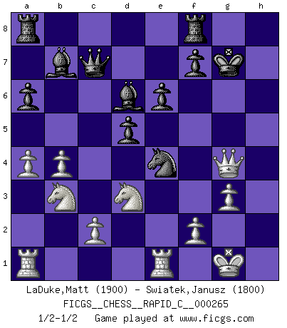 Last move : 1/2-1/2 2021 June 27 21:7:12 [Event "FICGS__CHESS__RAPID_C__000265"] [Site "FICGS"] [Date "2021.06.10"] [Round "1"] [White "LaDuke,Matt"] [Black "Swiatek,Janusz"] [Result "1/2-1/2"] [WhiteElo "1900"] [BlackElo "1800"] 1.e4 c5 2.Nc3 a6 3.g3 b5 4.Bg2 Bb7 5.Nge2 e6 6.d4 cxd4 7.Nxd4 Nf6 8.a3 Qc7 9.O-O d6 10.Re1 Nbd7 11.a4 b4 12.Na2 Nc5 13.Nxb4 Ncxe4 14.Be3 d5 15.Nd3 h5 16.b4 h4 17.Nb3 Bd6 18.Bd4 O-O 19.Bxe4 Nxe4 20.Bxg7 hxg3 21.hxg3 Kxg7 22.Qg4+ 1/2-1/2 Sicilian : Closed Kingside Castling by player White (move 9) Kingside Castling by player Black (move 18) This chess game ended in a draw. Follow this game move after move (download)We like to think. (Gary Kasparov) Versuche, dich von der Sklaverei der Eröffnungsvarianten zu befreien. Stattdessen soll man gewisse Typenpositionen erlernen, die man eingehend analysiert. (Aaron Nimzowitsch) Yo jugué Ajedrez con el y a veces le pude haber ganado solo que siempre devuelve su última jugada y juega la partida de manera diferente. (Mark Twain) Je ne crois pas en la psychologie, je crois aux bons coups. (Robert Fischer) A belief is an idea the mind possesses, an idea that possesses the mind. (Robert Oxden Bolton)