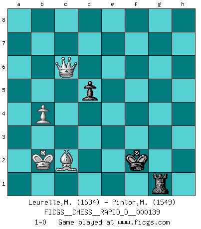 Last move : 1-0 2021 June 28 13:39:27 [Event "FICGS__CHESS__RAPID_D__000139"] [Site "FICGS"] [Date "2021.06.11"] [Round "1"] [White "Leurette,Marc-Antoine"] [Black "Pintor,Manuel"] [Result "1-0"] [WhiteElo "1634"] [BlackElo "1549"] 1.e4 e5 2.Nf3 Nc6 3.Bc4 Bc5 4.c3 Qf6 5.d4 exd4 6.e5 Nxe5 7.Qe2 d6 8.cxd4 Bb4+ 9.Nc3 Bg4 10.dxe5 Bxf3 11.exf6 Bxe2 12.Kxe2 Nxf6 13.Nd5 Nxd5 14.Bxd5 c6 15.Bb3 O-O 16.Be3 d5 17.Rad1 Rae8 18.Rd3 f5 19.Kd1 a5 20.a3 f4 21.Bb6 Bd6 22.Re1 h5 23.Bxa5 h4 24.Rxe8 Rxe8 25.Bd2 g5 26.Bc2 Kg7 27.g3 fxg3 28.fxg3 hxg3 29.hxg3 Kh6 30.Rf3 Kh5 31.Be1 Kg4 32.Rf7 Bxg3 33.Bxg3 Kxg3 34.Rxb7 Kf2 35.Rg7 Re1+ 36.Kd2 Re5 37.b4 Re2+ 38.Kc1 Re3 39.a4 Rg3 40.Rg6 g4 41.a5 Rg1+ 42.Kb2 g3 43.a6 g2 44.a7 Rh1 45.a8Q g1Q 46.Rxg1 Rxg1 47.Qxc6 1-0 Giuoco Piano Kingside Castling by player Black (move 15) 10 pieces endgame at move 34 : White KRBPP , Black KRPPP WHITE : King + 1 Rook 1 Bishop 2 Pawns BLACK : King + 1 Rook 3 Pawns Promotion Queen by player White (move 45) Promotion Queen by player Black (move 45) 9 pieces endgame at move 46 : White KQRBP , Black KRPP WHITE : King + 1 Queen 1 Rook 1 Bishop 1 Pawn BLACK : King + 1 Rook 2 Pawns 8 pieces endgame at move 46 : White KQBP , Black KRPP WHITE : King + 1 Queen 1 Bishop 1 Pawn BLACK : King + 1 Rook 2 Pawns 7 pieces endgame at move 47 : White KQBP , Black KRP WHITE : King + 1 Queen 1 Bishop 1 Pawn BLACK : King + 1 Rook 1 Pawn Player White won this chess game. Follow this game move after move (download)Chess is 99 percent tactics. (Teichmann) Bis zum Jahr 1971 verlief in meiner Schachkariere alles glatt. Dieses dramatische Match [Fischer-Taimanov 6:0] machte mein Leben zur Hölle. (Mark Taimanov) El ganar no lo es todo... pero el perder es nada. (Mednis) La vérité est comme le meilleur coup aux échecs : elle existe, mais il faut la chercher. (Arturo Perez-Reverte) The weakness of an artist is dogma. (Josh Waitzkin)