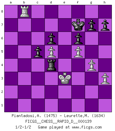 Last move : 1/2-1/2 2021 August 16 8:42:12 [Event "FICGS__CHESS__RAPID_D__000139"] [Site "FICGS"] [Date "2021.06.11"] [Round "1"] [White "Piantadosi,Angelo"] [Black "Leurette,Marc-Antoine"] [Result "1/2-1/2"] [WhiteElo "1475"] [BlackElo "1634"] 1.e4 e5 2.Nf3 Nc6 3.d4 exd4 4.Nxd4 Bc5 5.Be3 Nxd4 6.Bxd4 Bxd4 7.Qxd4 d6 8.Nc3 Nf6 9.Be2 O-O 10.O-O c5 11.Qd1 Be6 12.f4 a6 13.Bf3 Rb8 14.Qe2 b5 15.Rad1 b4 16.Nd5 Nxd5 17.exd5 Bf5 18.Qd2 a5 19.c3 Qd7 20.c4 a4 21.Rfe1 b3 22.a3 Bc2 23.Rc1 Qf5 24.g4 Qf6 25.Be4 Qxb2 26.Bxc2 bxc2 27.Rxc2 Qxa3 28.Re3 Qa1+ 29.Kg2 Rb3 30.Ra2 Qf6 31.Rxb3 axb3 32.Rb2 Rb8 33.Qe2 Qc3 34.h3 Kf8 35.f5 Re8 36.Qd2 Qxd2+ 37.Rxd2 Rb8 38.Rb2 f6 39.Kf3 Rb4 40.Ke3 Rxc4 41.Rxb3 Rd4 42.Rb8+ Kf7 43.Rb7+ Kg8 44.Rb8+ Kf7 45.Rb7+ Kf8 46.Rb8+ Kf7 1/2-1/2 Scotch game Kingside Castling by player Black (move 9) Kingside Castling by player White (move 10) This chess game ended in a draw. Follow this game move after move (download)Chess is the art which expresses the science of logic. (Mikhail Botvinnik) Wer sich die Fähigkeit anerziehen will im Schach selbstständig zu denken, der muß alles meiden, was leblos ist: ausgeklügelte Theorien, die sich auf sehr wenige Beispiele und eine Menge Hirngespinste stützen. (Emanuel Lasker) Bobby es la celebridad menos entendida y malinterpretada que camina el la faz de esta tierra. (Yasser Seirawan) Aucun coup ne doit être joué sans but. (Pedro Damiano) Humor is by far the most significant activity of the human brain. (Edward De Bono)