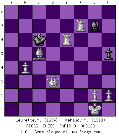 Last move : 1-0 2021 July 6 19:41:21 [Event "FICGS__CHESS__RAPID_D__000139"] [Site "FICGS"] [Date "2021.06.11"] [Round "1"] [White "Leurette,Marc-Antoine"] [Black "Kehayov,Yulian"] [Result "1-0"] [WhiteElo "1634"] [BlackElo "1313"] 1.e4 e5 2.Nf3 Nc6 3.Bc4 Nf6 4.Ng5 d5 5.exd5 Na5 6.Bb5+ c6 7.dxc6 bxc6 8.Qf3 cxb5 9.Qxa8 Qc7 10.Ne4 Nc6 11.Nxf6+ gxf6 12.Nc3 Bg7 13.Nxb5 Qd7 14.Nd6+ Qxd6 15.Qxc8+ Qd8 16.Qxc6+ Qd7 17.Qxd7+ Kxd7 18.d3 Rc8 19.c3 Ke6 20.Be3 f5 21.Bxa7 Ra8 22.Bc5 Ra5 23.b4 Ra3 24.O-O Rxc3 25.a4 Rxd3 26.a5 e4 27.Ra2 f4 28.a6 e3 29.fxe3 fxe3 30.a7 e2 31.Rxe2+ Kd5 32.a8Q+ Kc4 33.Rf4+ Kb5 34.Qa5+ Kc6 35.Qa6+ Kc7 36.Qxd3 Kc6 37.Rxf7 h5 38.Re6+ 1-0 Two knights defense Kingside Castling by player White (move 24) Promotion Queen by player White (move 32) Player White won this chess game. Follow this game move after move (download)There must have been a time when men were demigods, or they could not have invented Chess. (Gustav Schenk) Wenn du nicht weißt was du tun sollst, warte bis dein Gegner eine Idee hat. Sie wird sicher schlecht sein. (Siegbert Tarrasch) En la vida, como en el Ajedrez, los Peones propios obstruyen nuestro camino. La gran fortuna de un hombre, su comodidad, placer, hijos, libros, que deberían ayudarle a ganar, con mucha frecuencia lo ponen en Jaque Mate. (Charles Buxton) Echiquier : carré parfait, comme la Jérusalem nouvelle décrite par l'auteur de l'Apocalypse, huit cases sur huit, exaltation du chiffre 4, symbole du cosmos aux quatre horizons... où le noir et le blanc, l'ombre et la lumière, le mal et le bien s'entremêlent et se conjuguent. (Robert Couffignal, Le Gambit du poète) Warrior pose battles inner weakness and wins focus. You see that there is no war within you. You're on your own side, and you are your own strength. (Terri Guillemets)