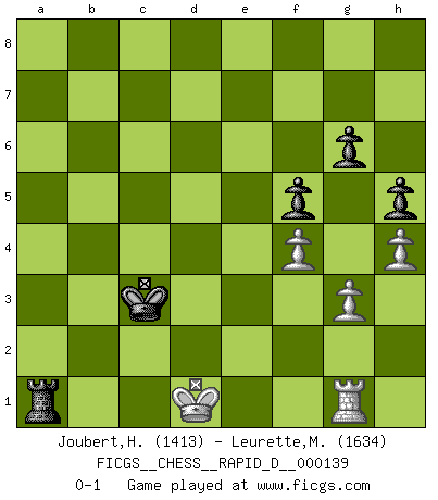 Last move : 0-1 2021 August 19 21:55:35 [Event "FICGS__CHESS__RAPID_D__000139"] [Site "FICGS"] [Date "2021.06.11"] [Round "1"] [White "Joubert,Hennie"] [Black "Leurette,Marc-Antoine"] [Result "0-1"] [WhiteElo "1413"] [BlackElo "1634"] 1.e4 e5 2.Bc4 Nf6 3.d4 exd4 4.e5 d5 5.Be2 Ne4 6.Nf3 Bb4+ 7.Bd2 Bxd2+ 8.Nbxd2 c5 9.O-O O-O 10.Bd3 Bg4 11.Nxe4 dxe4 12.Bxe4 Qc7 13.h3 Bxf3 14.Qxf3 Nc6 15.Qh5 g6 16.Qg5 Nxe5 17.f4 Nc4 18.Rfe1 Rae8 19.Bd5 Rxe1+ 20.Rxe1 Ne3 21.Be4 b6 22.Qf6 Qd8 23.Qxd8 Rxd8 24.Kf2 f5 25.Bd3 Kg7 26.g3 h5 27.h4 Ra8 28.Ke2 a6 29.Kd2 b5 30.b3 b4 31.Kc1 a5 32.Kd2 a4 33.Kc1 axb3 34.axb3 Kf6 35.Kd2 Ra2 36.Rc1 Ke6 37.Re1 Kd5 38.Rc1 c4 39.bxc4+ Nxc4+ 40.Bxc4+ Kxc4 41.Rb1 Ra3 42.Rg1 b3 43.cxb3+ Rxb3 44.Rc1+ Rc3 45.Rg1 d3 46.Ke3 Rc2 47.Rf1 Kc3 48.Rd1 d2 49.Ke2 Ra2 50.Rg1 d1Q+ 51.Kxd1 Ra1+ 0-1 Bishop's Opening : Ponziani gambit Kingside Castling by player White (move 9) Kingside Castling by player Black (move 9) Promotion Queen by player Black (move 50) 10 pieces endgame at move 51 : White KRPPP , Black KRPPP WHITE : King + 1 Rook 3 Pawns BLACK : King + 1 Rook 3 Pawns Player Black won this chess game. Follow this game move after move (download)Help your pieces so they can help you. (Paul Morphy) Wenn du auf das Glück wartest, wird das Leben ziemlich langweilig. (Mikhail Nekhemyevich Tal) Mi estilo es algo parecido entre un poco de Tal y Petrosian. (Reshevsky) Il n'y a pas eu de défaite parce que je ne crois pas que cet ordinateur ait jamais existé. IBM a triché en refusant d'imprimer les modes de recherche de la machine. C'est évident, pendant le match, des coups décisifs ont été joués par des êtres humains. Aujourd'hui, les meilleurs spécialistes en informatique ne peuvent toujours pas expliquer comment Deep-Blue a pu jouer contre la logique des ordinateurs. IBM a gagné une guerre de communication, mais ils sont incapables de prouver que l'ordinateur a gagné tout seul. (Garry Kasparov) You can only get smarter by playing a smarter opponent. (Revolver, movie)