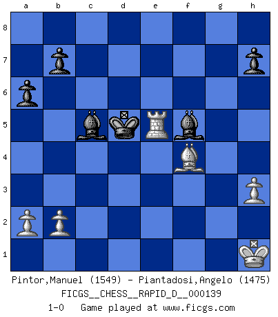 Last move : 1-0 2021 July 28 22:31:34 [Event "FICGS__CHESS__RAPID_D__000139"] [Site "FICGS"] [Date "2021.06.11"] [Round "1"] [White "Pintor,Manuel"] [Black "Piantadosi,Angelo"] [Result "1-0"] [WhiteElo "1549"] [BlackElo "1475"] 1.e4 e6 2.f4 d5 3.exd5 exd5 4.Nf3 c5 5.d4 Nc6 6.c4 cxd4 7.Nxd4 Nxd4 8.Qxd4 Nf6 9.Nc3 dxc4 10.Qxd8+ Kxd8 11.Bxc4 Ke7 12.O-O g6 13.Re1+ Kd8 14.Bxf7 Bc5+ 15.Kh1 Rf8 16.Bc4 Re8 17.Bd2 Rxe1+ 18.Rxe1 Bf5 19.h3 a6 20.Nd5 Nxd5 21.Bxd5 Rb8 22.g4 Bd3 23.Bg8 Kc7 24.Be6 Re8 25.f5 gxf5 26.gxf5 Kd6 27.Bf4+ Kc6 28.Bd5+ Kxd5 29.Rxe8 Bxf5 30.Re5+ 1-0 French : Labourdonnais variation Kingside Castling by player White (move 12) Player White won this chess game. Follow this game move after move (download)I prefer to lose a really good game than to win a bad one. (David Levy) Karpov ist ein Museumsstück. (Garry Kasparov) Solo el jugador con la iniciativa tiene el derecho a atacar. (Wilhelm Steinitz) Si je n'étais pas joueur d'échecs, je serais le meilleur dans quelque chose d'autre. (Anatoli Karpov) Creativity is allowing yourself to make mistakes. Art is knowing which ones to keep. (Scott Adams)