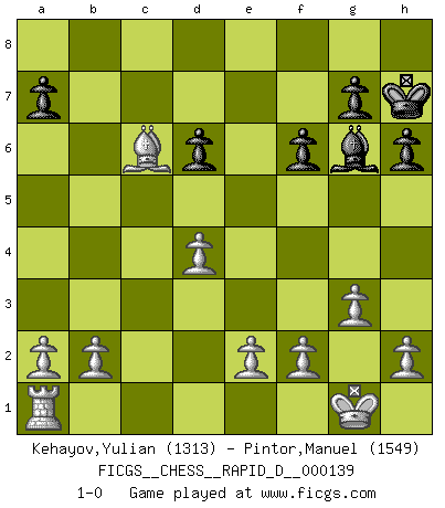 Last move : 1-0 2021 July 7 1:8:13 [Event "FICGS__CHESS__RAPID_D__000139"] [Site "FICGS"] [Date "2021.06.11"] [Round "1"] [White "Kehayov,Yulian"] [Black "Pintor,Manuel"] [Result "1-0"] [WhiteElo "1313"] [BlackElo "1549"] 1.d4 d5 2.c4 c6 3.Nf3 Bg4 4.Ne5 Bh5 5.Qb3 Qb6 6.Qh3 Bg6 7.Qc8+ Qd8 8.Qxb7 Nd7 9.Nxd7 Rc8 10.Nxf8 Rc7 11.Qb4 Kxf8 12.Nc3 Nf6 13.g3 h6 14.Bh3 Kg8 15.Bf4 dxc4 16.Bxc7 Qxc7 17.Qxc4 Ne4 18.Bg2 Nxc3 19.Qxc3 Kh7 20.O-O Rc8 21.Rfc1 Qd6 22.Qc5 f6 23.Qxd6 exd6 24.Rxc6 Rxc6 25.Bxc6 1-0 QGD Slav : 3.Nf3 Kingside Castling by player White (move 20) Player White won this chess game. Follow this game move after move (download)Don't even mention losing to me. I can't stand to think of it. (Bobby Fischer) Rauchen ist dem Schachspieler bei seiner Arbeit, also im Wettkampf, untersagt. (Viktor Kortschnoi) No todos los artistas son jugadores de Ajedrez, pero todos los jugadores de Ajedrez son artistas. (Marcel Duchamp) La tactique est l'élément le plus important du milieu de jeu. (Siegbert Tarrasch) Only sick music makes money today. (Friedrich Nietzsche)