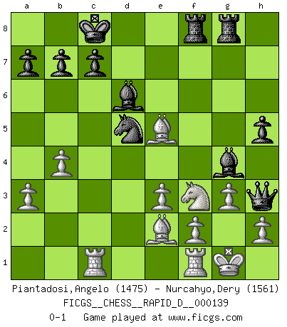 Last move : 0-1 2021 July 24 0:18:17 [Event "FICGS__CHESS__RAPID_D__000139"] [Site "FICGS"] [Date "2021.06.11"] [Round "1"] [White "Piantadosi,Angelo"] [Black "Nurcahyo,Dery"] [Result "0-1"] [WhiteElo "1475"] [BlackElo "1561"] 1.d4 d5 2.c4 Nf6 3.cxd5 Qxd5 4.Nc3 Qf5 5.Nf3 h6 6.e3 e6 7.Bd3 Qa5 8.Bd2 Bb4 9.O-O Nc6 10.a3 Bd6 11.Ne4 Qd5 12.Nxf6+ gxf6 13.Rc1 Qh5 14.Bc3 Bd7 15.b4 Rg8 16.g3 e5 17.dxe5 fxe5 18.Be2 Bg4 19.Qd5 O-O-O 20.Kg2 Qh3+ 21.Kg1 h5 22.Qxf7 Rdf8 23.Qd5 Ne7 24.Bxe5 Nxd5 0-1 QGD : Marshall defense Kingside Castling by player White (move 9) Queenside Castling by player Black (move 19) Player Black won this chess game. Follow this game move after move (download)At this time Fischer is simply a level above all the best Chessplayers in the world. (John Jacobs) Im Schach gibt es keinen Platz für Galanterie. (Irving Chernev) Nunca nadie ha ganado una partida de Ajedrez rindiendose. (Unknown) La solitude du joueur d'Echecs à l'approche du mat est semblable à celle du condamné. (Francis Szpiner) All men can see these tactics whereby I conquer, but what none can see is the strategy out of which victory is evolved. (Sun Tzu)