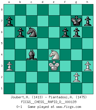 Last move : 0-1 2021 September 13 9:13:39 [Event "FICGS__CHESS__RAPID_D__000139"] [Site "FICGS"] [Date "2021.06.11"] [Round "1"] [White "Joubert,Hennie"] [Black "Piantadosi,Angelo"] [Result "0-1"] [WhiteElo "1413"] [BlackElo "1475"] 1.e4 Nf6 2.e5 Nd5 3.d4 d6 4.c4 Nb6 5.f4 dxe5 6.fxe5 e6 7.Nc3 Be7 8.Nf3 O-O 9.Be3 N8d7 10.Be2 c5 11.d5 exd5 12.cxd5 Re8 13.d6 Bf8 14.Bf4 f6 15.Qb3+ Kh8 16.e6 c4 17.Bxc4 Nc5 18.Qb4 Bxd6 19.Bxd6 Qxd6 20.O-O Nxc4 21.Qxc4 Bxe6 22.Qd4 Qxd4+ 23.Nxd4 Bc4 24.Rfe1 Nd3 25.Rxe8+ Rxe8 26.Nf3 Nxb2 27.Rb1 Nd3 28.h3 b6 29.a3 g6 30.Nd4 Re1+ 31.Rxe1 Nxe1 32.Kf2 Nd3+ 33.Ke3 Kg7 34.Ne4 Ne5 35.Nc6 Nxc6 0-1 Alekhine's defense : Four pawns attack Kingside Castling by player Black (move 8) Kingside Castling by player White (move 20) Player Black won this chess game. Follow this game move after move (download)Examine moves that smite! A good eye for smites is far more important than a knowledge of strategical principles. (Purdy) Ja, ich habe einmal eine Blitzpartie gespielt, es war in einem Zug, 1929. --im Interview 1989 (Mikhail Moiseyevich Botvinik) Una compensación adecuada por un sacrificio es tener una combinación sólida que conduce a una posición ganadora; una compensación adecuada por una metida de pata es dejar a tu oponente arrebatar una derrota de las fauces de la victoria. (Bruce A. Moon) Les échecs, c'est la lutte contre l'erreur. (Johannes Zukertort) Chess is as much a mystery as women. (Purdy)