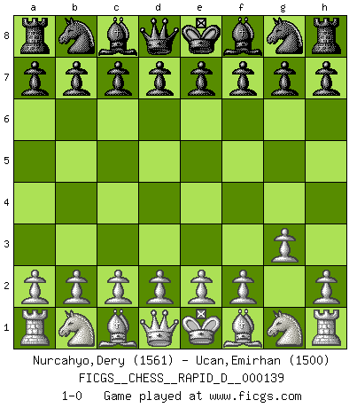 Last move : 1-0 2021 July 12 11:23:39 [Event "FICGS__CHESS__RAPID_D__000139"] [Site "FICGS"] [Date "2021.06.11"] [Round "1"] [White "Nurcahyo,Dery"] [Black "Ucan,Emirhan"] [Result "1-0"] [WhiteElo "1561"] [BlackElo "1500"] 1.g3 1-0 This chess game has been lost on time (started : 2021.06.11 8:52:48) Benko's Opening Player White won this chess game. Follow this game move after move (download)On the chessboard, lies and hypocrisy do not survive long. (Emanuel Lasker) Ich verstehe Aljechins Kombinationen ganz gut; aber woher er diese Angriffschancen bekommt und wie er die Eröffnung behandelt das ist für mich ein Buch mit sieben Siegeln. (Rudolf Spielmann) No hay otro maestro que tenga una voluntad terrífica de ganar. Al tablero, el irradía peligro y aún los oponentes mas fuertes tienden a congelarse como liebres cuando olfatean a una pantera. Aún sus debilidades son peligrosas. Con las blancas, su juego de apertura es predecible - te es posible hacer planes en su contra - pero es tan fuerte que tus planes casi nunca funcionan. En el juego medio, su precisión e invención son fabulosas y en finales, tú simplemente no le puedes vencer. (Experto Alemán anónimo) À la honte des hommes, on sait que les lois du jeu sont les seules qui soient partout justes, claires, inviolables et exécutées. Pourquoi l'Indien qui a donné les règles du jeu d'échecs est-il obéi de bon gré dans toute la terre, et que les décrétales des papes, par exemple, sont aujourd'hui un objet d'horreur et de mépris ? C'est que l'inventeur des échecs combina tout avec justesse pour la satisfaction des joueurs, et que les papes, dans leurs décrétales, n'eurent en vue que leur seul avantage. L'Indien voulut exercer également l'esprit des hommes et leur donner du plaisir; les papes ont voulu abrutir l'esprit des hommes. Voltaire (Dictionnaire philosophique / Garnier 1967) Wisdom is the reward you get for a lifetime of listening when you'd have preferred to talk. (Doug Larson)