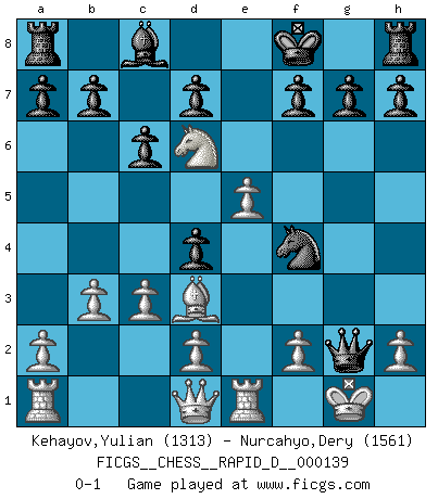 Last move : 0-1 2021 July 8 5:33:48 [Event "FICGS__CHESS__RAPID_D__000139"] [Site "FICGS"] [Date "2021.06.11"] [Round "1"] [White "Kehayov,Yulian"] [Black "Nurcahyo,Dery"] [Result "0-1"] [WhiteElo "1313"] [BlackElo "1561"] 1.e4 e5 2.Nf3 Nc6 3.Bb5 Nd4 4.Nxd4 exd4 5.O-O c6 6.Bc4 Qf6 7.e5 Qg6 8.Re1 Bc5 9.b3 Ne7 10.Ba3 Bxa3 11.Bd3 Qg5 12.Nxa3 Nd5 13.Nc4 Nf4 14.Nd6+ Kf8 15.c3 Qxg2+ 0-1 Ruy Lopez : Bird's defense Kingside Castling by player White (move 5) Player Black won this chess game. Follow this game move after move (download)It is difficult to play against Einstein's theory --on his first loss to Fischer. (Mikhail Tal) Die FIDE ist dabei in die Hände der russischen Mafia zu fallen. (Larry Evans) Bobby es la celebridad menos entendida y malinterpretada que camina el la faz de esta tierra. (Yasser Seirawan) Les sacrifices démontrent seulement que quelqu'un a gaffé. (Savielly Tartacover) Lamb in skin of tiger, still fears the wolf. (Chinese proverb)