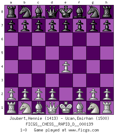 Last move : 1-0 2021 July 11 22:21:58 [Event "FICGS__CHESS__RAPID_D__000139"] [Site "FICGS"] [Date "2021.06.11"] [Round "1"] [White "Joubert,Hennie"] [Black "Ucan,Emirhan"] [Result "1-0"] [WhiteElo "1413"] [BlackElo "1500"] 1.e4 1-0 This chess game has been lost on time (started : 2021.06.11 8:52:48) King's pawn Opening Player White won this chess game. Follow this game move after move (download)Later, I began to succeed in decisive games. Perhaps because I realized a very simple truth: not only was I worried, but also my opponent. (Mikhail Tal) Im Spitzenschach von heute geht es nur um Vorbereitung, um tiefgründige, sorgfältige Eröffnungsvorbereitung. (Nigel Short) La mitad de las variaciones que son calculadas en una partida de torneo, resultan ser completamente superfluas. Desafortunadamente, nadie sabe por adelantado cual mitad. (Jan Tinman) Si rien de grave n'est détecté lors de l'analyse d'une position, on joue alors le coup. Seconde règle de Blumenfeld. Perfection is achieved, not when there is nothing more to add, but when there is nothing left to take away. (Antoine de Saint-Exupéry)