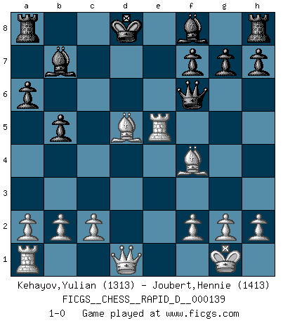 Last move : 1-0 2021 July 22 11:38:18 [Event "FICGS__CHESS__RAPID_D__000139"] [Site "FICGS"] [Date "2021.06.11"] [Round "1"] [White "Kehayov,Yulian"] [Black "Joubert,Hennie"] [Result "1-0"] [WhiteElo "1313"] [BlackElo "1413"] 1.e4 c5 2.Nf3 e6 3.Bc4 Nc6 4.O-O d6 5.Re1 Nf6 6.Nc3 a6 7.d4 cxd4 8.Nxd4 Qc7 9.Nxc6 Qxc6 10.Be2 b5 11.e5 Nd5 12.Bf3 Bb7 13.Nxd5 exd5 14.exd6 Kd8 15.Re5 Qxd6 16.Bf4 Qf6 17.Bxd5 1-0 Sicilian defense Kingside Castling by player White (move 4) Player White won this chess game. Follow this game move after move (download)When in doubt... play Chess ! (Tevis) Jeder weiß, dass Gasprom Putins persönliches Machtinstrument ist. Die Firma wird vom Kreml aus geleitet und wird schon deshalb nie transparent sein. (Garry Kasparov) El Ajedrez es un mar en el cual un mosquito puede beber y un elefante puede bañarse. (Refrán Hindú) Le jeu d'échecs fait naître et fortifie en nous plusieurs qualités précieuses dans le cours de l'existence, telles que la prévoyance, la circonspection, la prudence, et la persévérance. (Benjamin Franklin - 1783, la morale des échecs) Life is the sum of all your choices. (Albert Camus)
