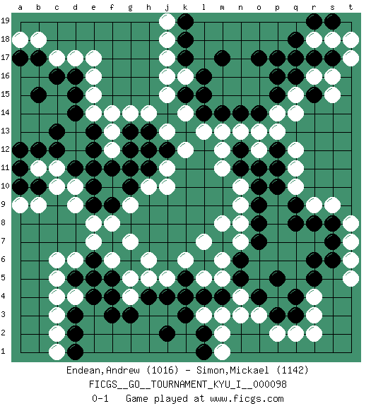 Last move : 0-1 2021 September 27 21:32:58 [Event "FICGS__GO__TOURNAMENT_KYU_I__000098"] [Site "FICGS"] [Date "2021.06.12"] [Round "1"] [Black "Endean,Andrew"] [White "Simon,Mickael"] [Result "0-1"] [Rating 1 "1016"] [Rating 2 "1142"] 1.q4 d4 2.q16 d17 3.d15 q14 4.o17 o3 5.r6 l3 6.f3 c6 7.f5 d10 8.c13 e15 9.d14 e14 10.e13 f13 11.e12 f12 12.e11 k16 13.m17 e8 14.f9 f8 15.e9 d9 16.e10 r16 17.r15 q15 18.r17 s16 19.s17 q17 20.p16 s15 21.p15 p14 22.o14 o13 23.n14 n13 24.m14 m13 25.l14 l13 26.l16 k14 27.k15 j15 28.l15 j16 29.k17 j17 30.k18 j18 31.k19 r3 32.q3 r4 33.r5 q2 34.p5 r2 35.k4 m5 36.n6 m6 37.n5 n4 38.o4 n3 39.m7 n7 40.o7 n8 41.o8 n9 42.o9 n10 43.o10 q10 44.q9 r9 45.q8 s9 46.r8 l7 47.k3 g4 48.f4 g5 49.g6 j5 50.k5 k6 51.j4 h6 52.h4 h5 53.g3 f6 54.e6 g7 55.d5 c5 56.d3 c3 57.e4 c4 58.d2 e16 59.d16 c17 60.c16 g9 61.g10 j10 62.h11 j11 63.h12 j13 64.h13 h14 65.f11 h10 66.d11 c11 67.c12 b11 68.b12 t17 69.q18 t6 70.s7 t7 71.s6 t5 72.p3 p2 73.p10 q11 74.p11 q12 75.p12 p13 76.l2 m2 77.l1 m1 78.j2 c2 79.d1 c1 80.l4 m3 81.m4 m8 82.g13 g14 83.g12 f14 84.j12 k12 85.g11 e7 86.b17 b18 87.a17 a18 88.b15 e17 89.a11 b9 90.a10 a9 91.a12 r18 92.p17 s18 93.q17 j19 94.b10 c10 95.n11 m11 96.n12 o12 97.o11 m12 98.s8 t8 99.r19 t18 100.s19 d6 101.e5 l5 0-1 Here are the names of the openings (joseki) played in the four corners : Corner d16 : d17 d15 Komoku (Somok, Xiao~mu`) 3-4 Point. The komoku (3-4) point is the traditional corner enclosure move.. Ikken Takagakari (Hankan Nop'dakeolch'im, Yi Gaogua`jiao~, 1-Space High Approach). The 5-4 approach move has become more popular in modern times, as modern Go emphasizes speed and influence. Corner q16 : q16 q14 Hoshi (Hwajeom, Seongjeom, Xingwei`) 4-4 Point. The star or hoshi (4-4) point, emphasizing influence at the potential expense of territory. Ikken Takagakari (Hankan Nop'dakeolch'im, Yi Gaojia, 1-Space High Approach). Black typically responds at 6-4 or 3-10. Black 4-10 is played when Black finds play on the right side advantageous. Black 4-8 or 3-8 may be played when Black has support at top. Corner q4 : q4 o3 Hoshi (Hwajeom, Seongjeom, Xingwei`) 4-4 Point. The star or hoshi (4-4) point, emphasizing influence at the potential expense of territory. Ikken Kakari (Hankan Keolch'im, Yi Gua`jiao~, 1-Space Low Approach). White 2 is the standard approach move to the 4-4. Corner d4 : d4 f3 Hoshi (Hwajeom, Seongjeom, Xingwei`) 4-4 Point. The star or hoshi (4-4) point, emphasizing influence at the potential expense of territory. Ikken Kakari (Hankan Keolch'im, Yi Gua`jiao~, 1-Space Low Approach). Black 2 is the standard approach move to the 4-4. Player White won this Go (weiqi, baduk) game. Follow this game move after move (download)Nothing requires doing this or that, but necessity exists. (Pierre Audouard) The problem with troubleshooting is that trouble shoots back. (Anonymous)