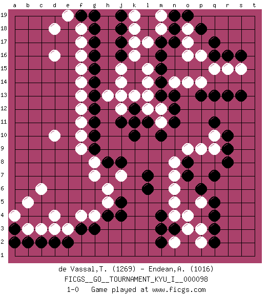 Last move : 1-0 2021 August 17 9:8:2 [Event "FICGS__GO__TOURNAMENT_KYU_I__000098"] [Site "FICGS"] [Date "2021.06.12"] [Round "1"] [Black "de Vassal,Thibault"] [White "Endean,Andrew"] [Result "1-0"] [Rating 1 "1269"] [Rating 2 "1016"] 1.q4 d16 2.q16 d4 3.f3 c6 4.d2 c3 5.j4 d10 6.r10 k16 7.k10 o17 8.q17 o16 9.p13 o3 10.q3 o4 11.p6 n6 12.m4 f4 13.g3 g4 14.h4 h5 15.g10 f9 16.g9 f10 17.g11 f11 18.g12 f12 19.g13 f13 20.g14 f14 21.g15 f15 22.g16 f16 23.g17 f17 24.n3 n5 25.l6 n8 26.o7 n7 27.m10 j7 28.l7 p9 29.o8 n14 30.n12 m12 31.n11 m11 32.l11 l12 33.k12 k13 34.j5 h6 35.j8 g8 36.h8 g7 37.c2 e3 38.e2 d3 39.b2 b3 40.a3 a4 41.a2 b5 42.m13 l13 43.n13 j12 44.k11 j13 45.m14 l14 46.m15 l15 47.m16 l17 48.m17 m18 49.n18 m19 50.n19 k18 51.n17 j15 52.g18 f18 53.f19 e19 54.g19 d18 55.j11 h13 56.j17 k17 57.j18 k19 58.j19 j14 59.j16 r15 60.r16 q15 61.r13 p16 62.p18 o18 63.o19 p5 64.q5 o9 65.q7 n2 66.m2 n4 67.m3 p2 68.q2 p3 69.r9 q10 70.q11 q9 71.r8 p14 72.q13 o14 73.s16 s15 74.s13 1-0 Here are the names of the openings (joseki) played in the four corners : Corner d4 : d4 f3 Hoshi (Hwajeom, Seongjeom, Xingwei`) 4-4 Point. The star or hoshi (4-4) point, emphasizing influence at the potential expense of territory. Ikken Kakari (Hankan Keolch'im, Yi Gua`jiao~, 1-Space Low Approach). Black 2 is the standard approach move to the 4-4. Corner q16 : q16 o17 Hoshi (Hwajeom, Seongjeom, Xingwei`) 4-4 Point. The star or hoshi (4-4) point, emphasizing influence at the potential expense of territory. Ikken Kakari (Hankan Keolch'im, Yi Gua`jiao~, 1-Space Low Approach). White 2 is the standard approach move to the 4-4. Corner q4 : q4 o3 Hoshi (Hwajeom, Seongjeom, Xingwei`) 4-4 Point. The star or hoshi (4-4) point, emphasizing influence at the potential expense of territory. Ikken Kakari (Hankan Keolch'im, Yi Gua`jiao~, 1-Space Low Approach). White 2 is the standard approach move to the 4-4. Corner d16 : d16 g11 Hoshi (Hwajeom, Seongjeom, Xingwei`) 4-4 Point. The star or hoshi (4-4) point, emphasizing influence at the potential expense of territory. Player Black won this Go (weiqi, baduk) game. Follow this game move after move (download)The game plays itself, the players don't control it. (Pierre Audouard) The modern world has divided itself into Conservatives and Progressives. The business of Progressives is to go on making mistakes. The business of the Conservatives is to prevent the mistakes from being corrected. (G.K. Chesterton)